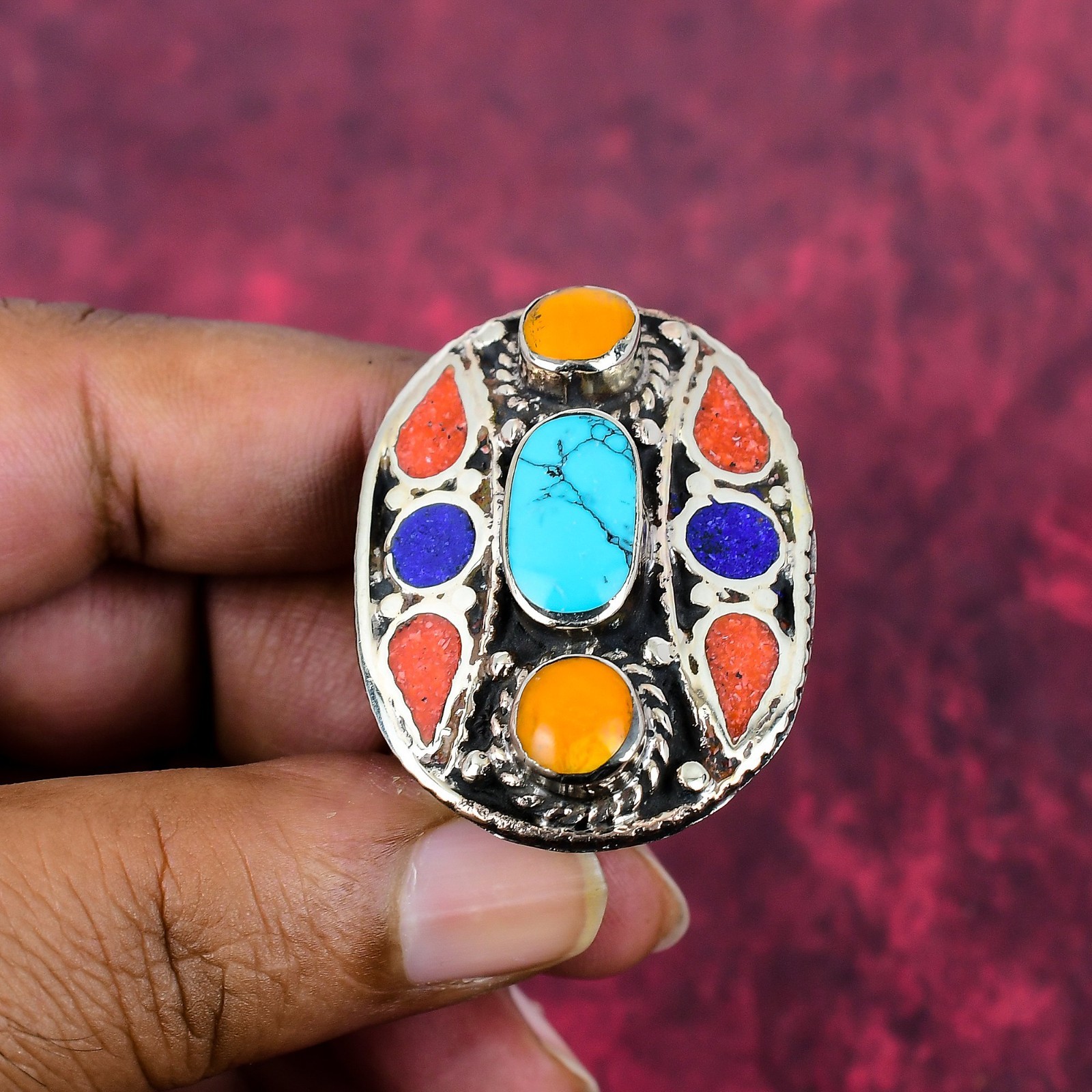 Turquoise, Coral Gemstone Handmade Jewelry 925 Sterling Silver Nepali Ring