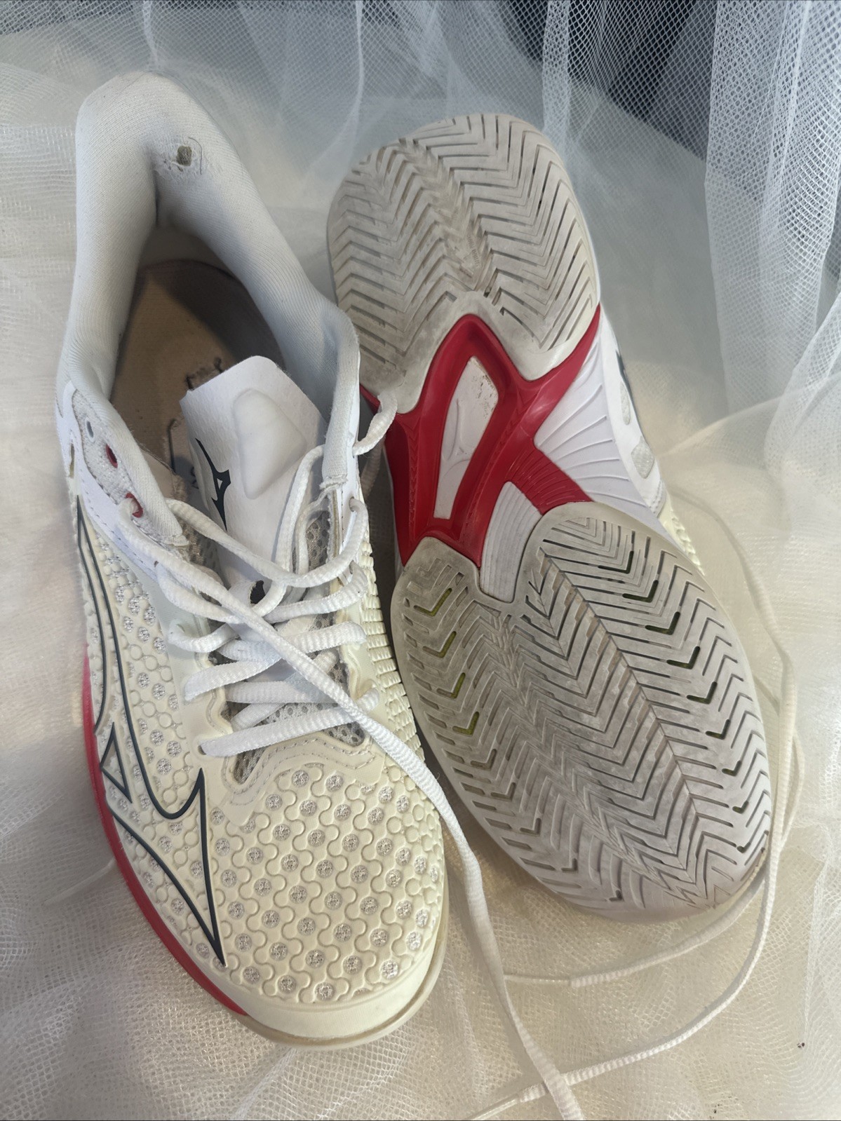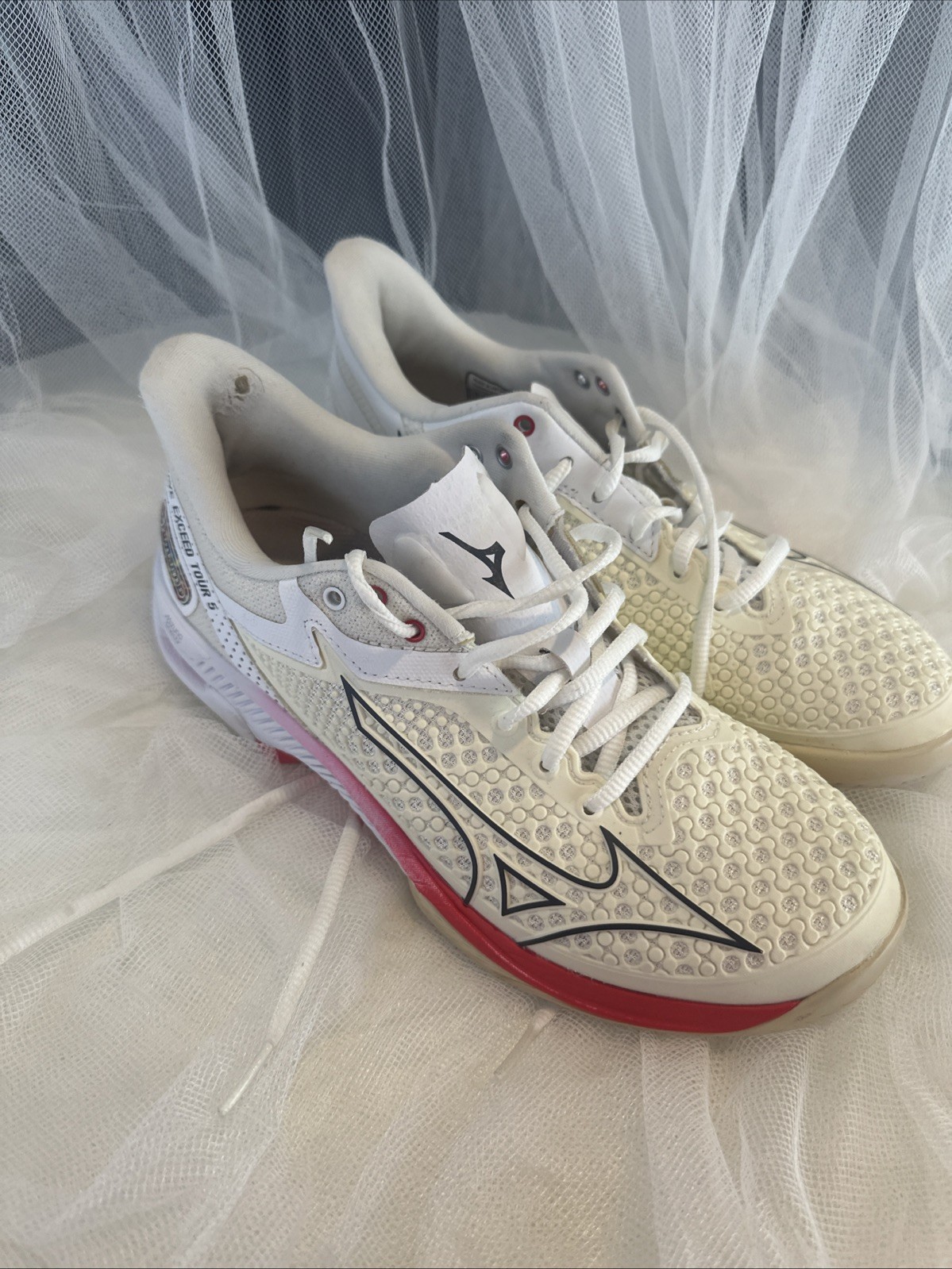как выглядит white Mizuno Wave Exceed Tour 5 tennis shoes with pink accents Size 8.5 фото