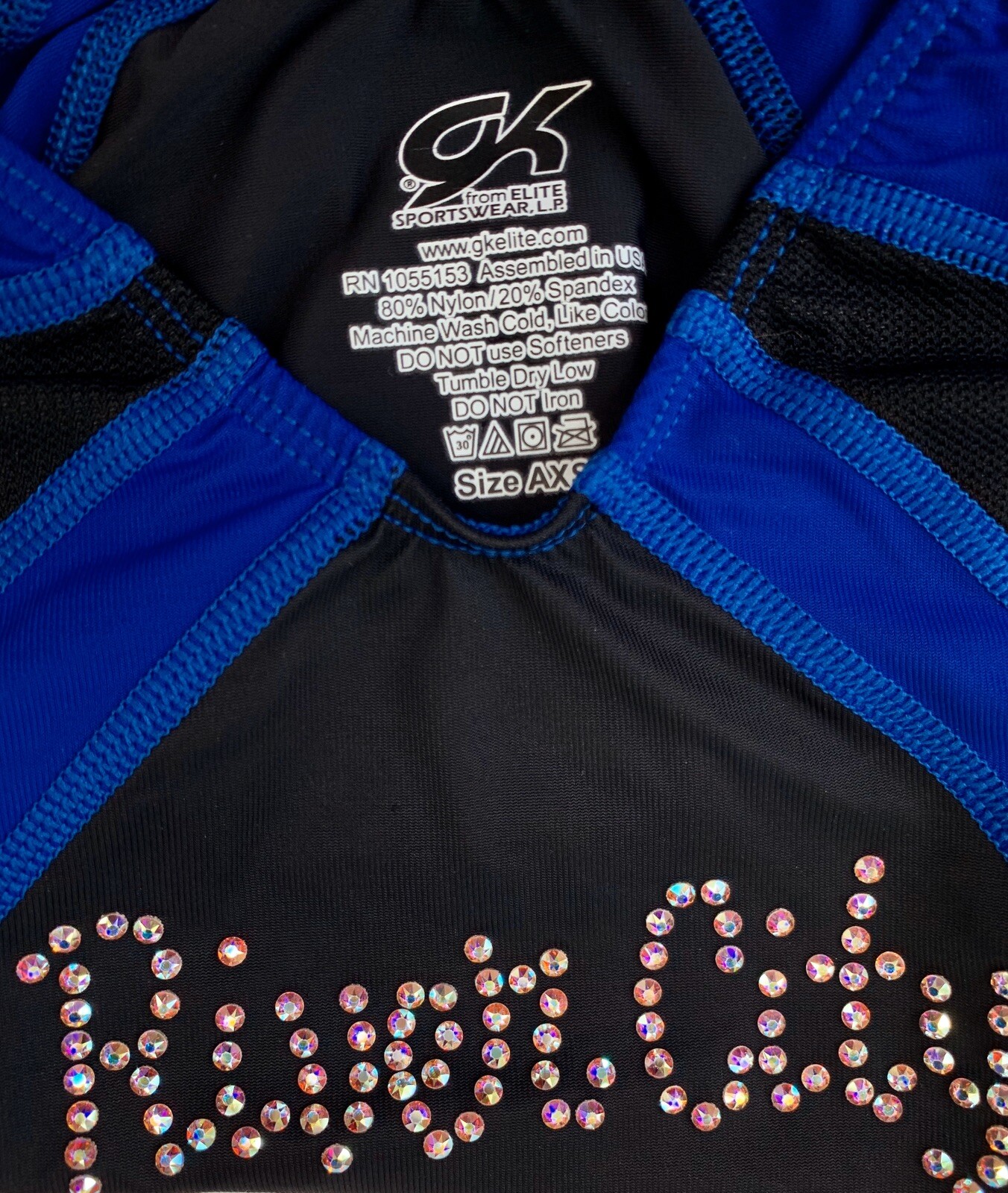 GK ELITE Leotard GYMNASTICS Black Blue RIVER CITY Swarovski RHINESTONES Mesh AXS