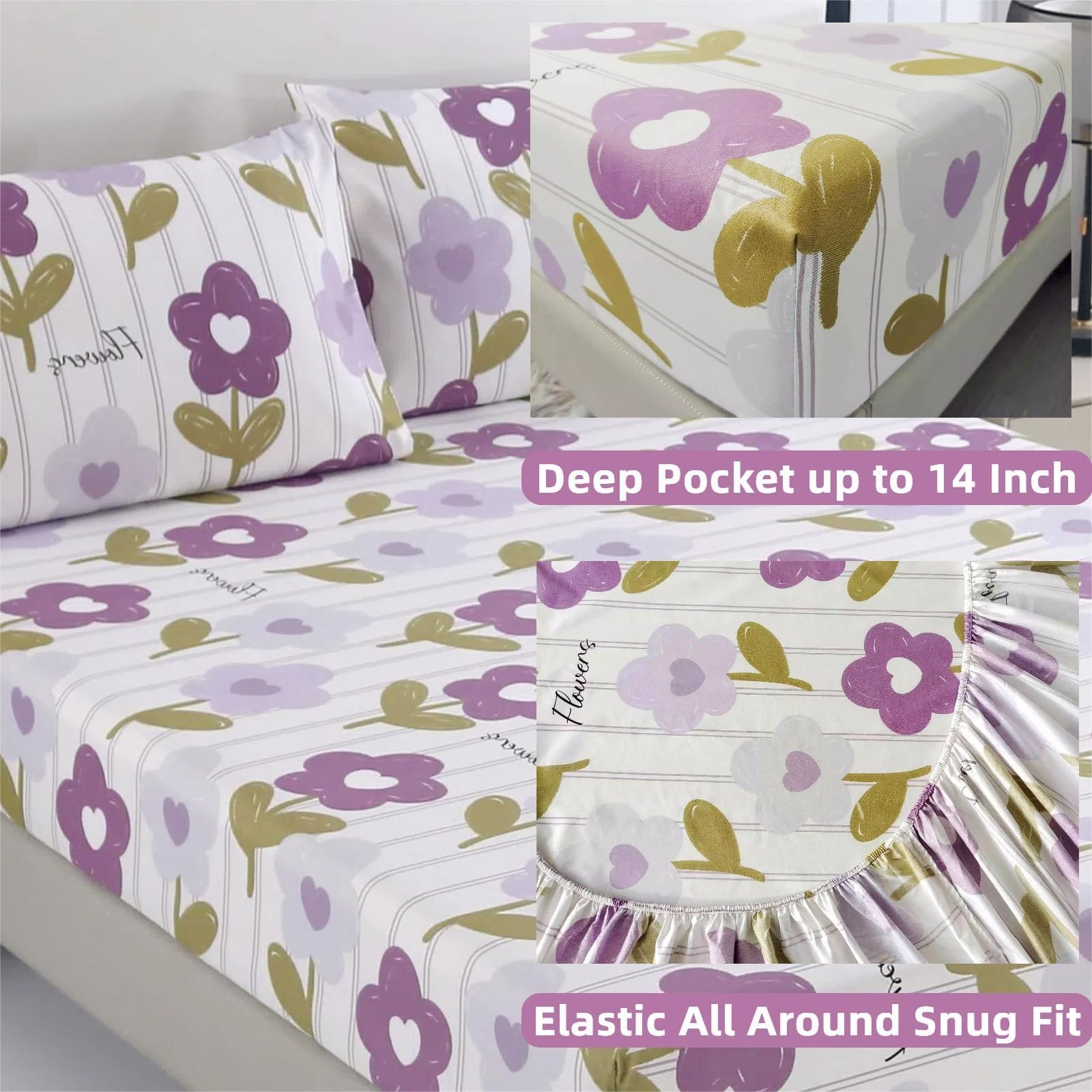 Purple Floral Fitted Sheet Full with 2 Pillowcases, Not Including Flat Sheet,...