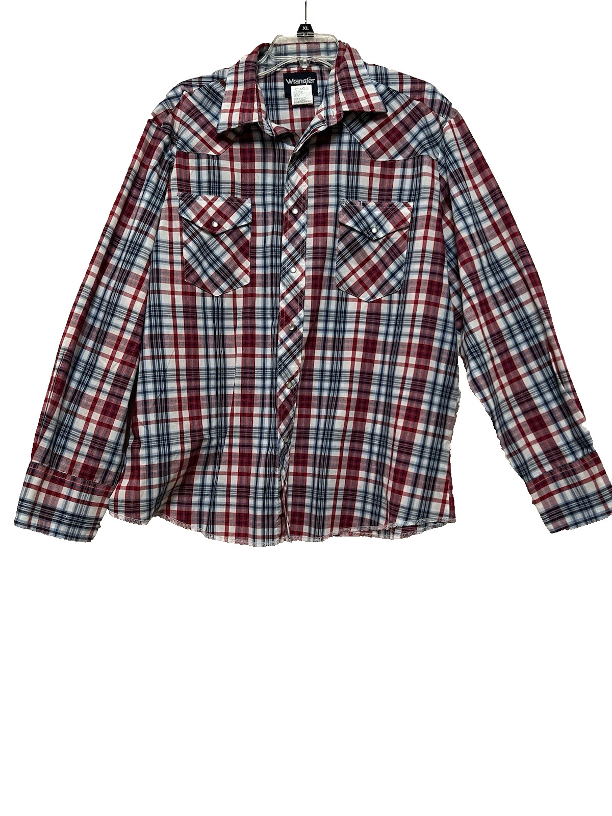 WRANGLER Western Pearl Snap Plaid Shirt Mens XL Cowboy Rodeo Red White Blue