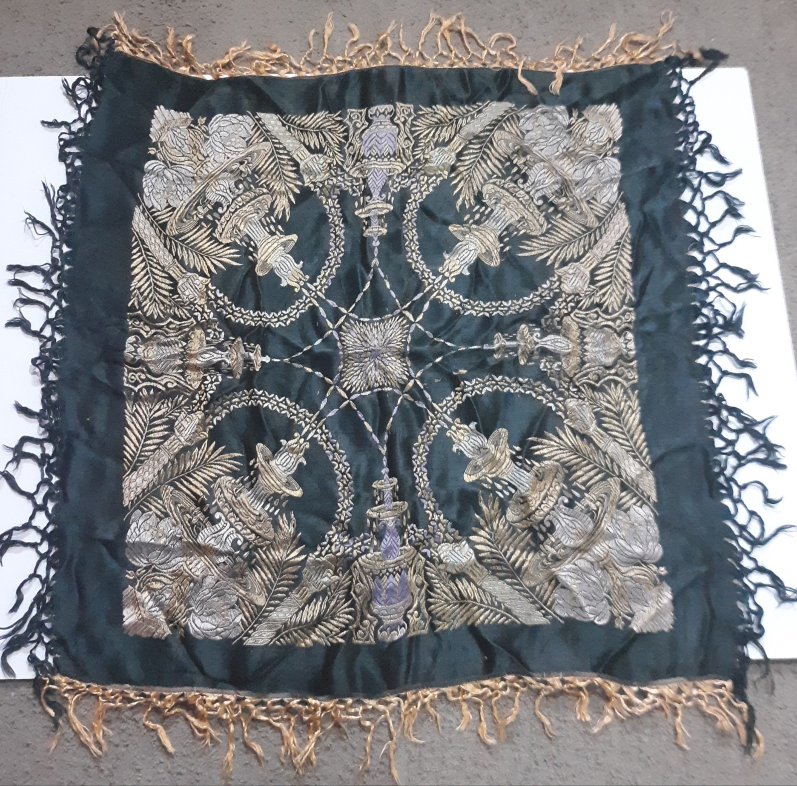 Antique Victorian Black Silk Scarf Shawl Piano Wrap Embroidered Hand Knotted
