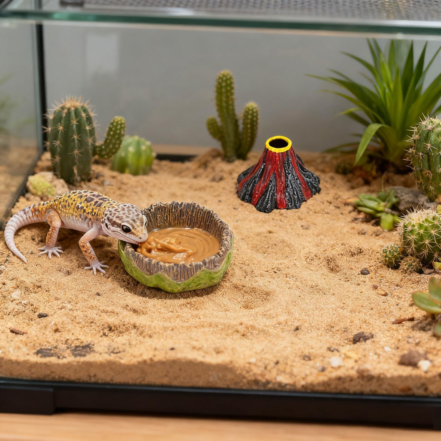 Small Reptile Feeding Dish 2-Pack, Resin Volcano Food Water Bowls for Geckos,