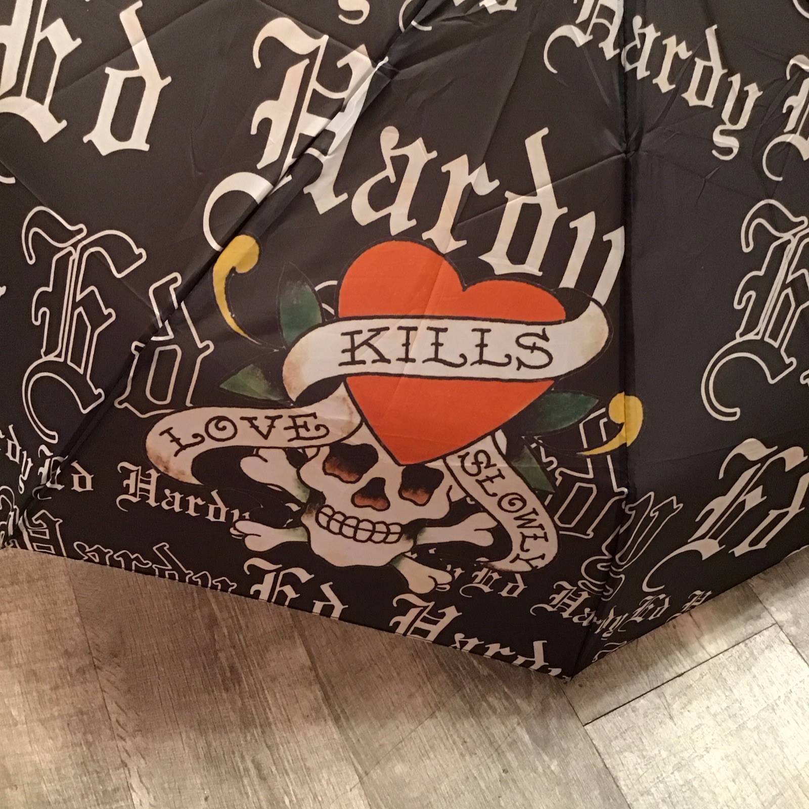 как выглядит Ed Hardy Black Multicolor Compact Size Umbrella Love Kills Slowly Skulls Hearts фото