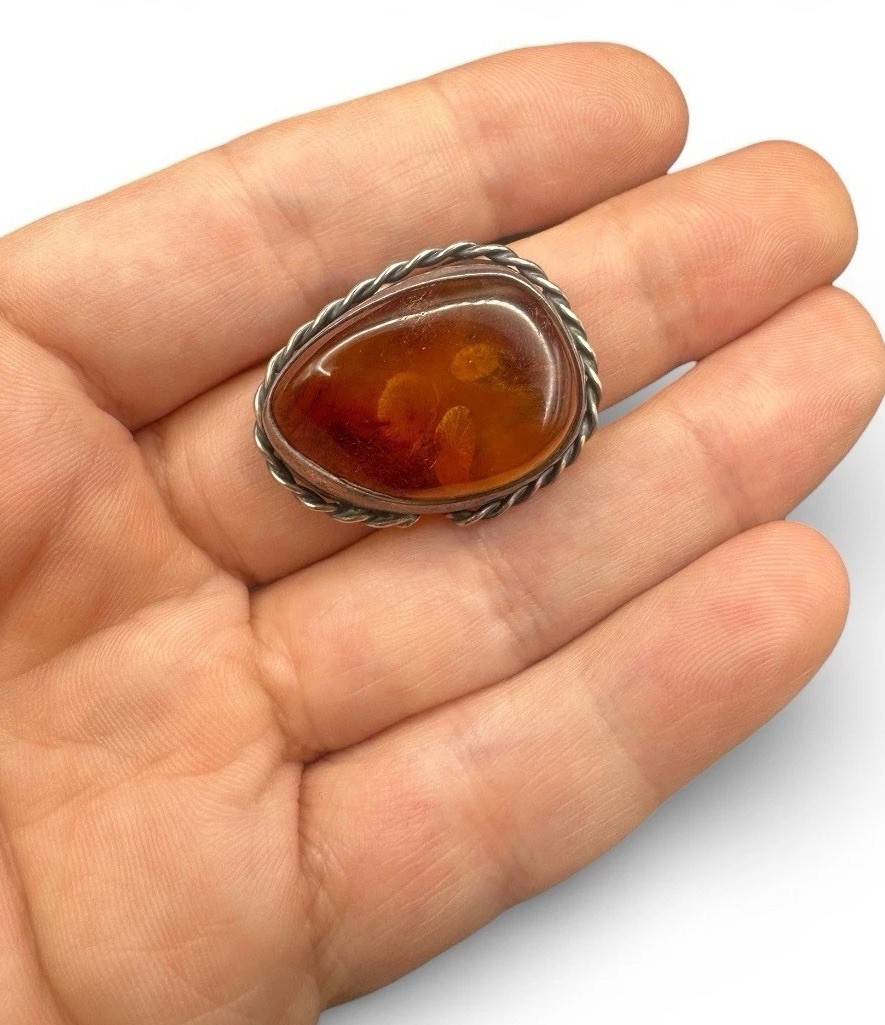 Vtg BIG Sterling Silver Chunky Baltic Cognac Amber Ring 8g Polish Marks Sz 9.75