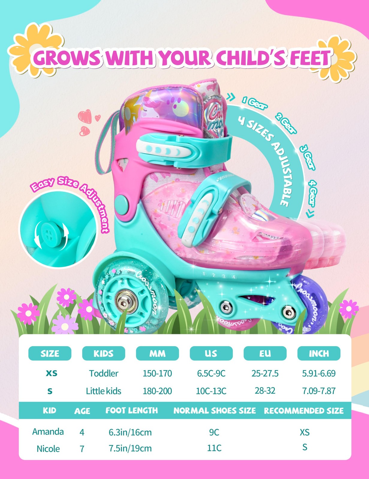 Unicorn Roller Skates, 4 Adjustable Sizes, Fun Light-Up Wheels, Safety Three-...