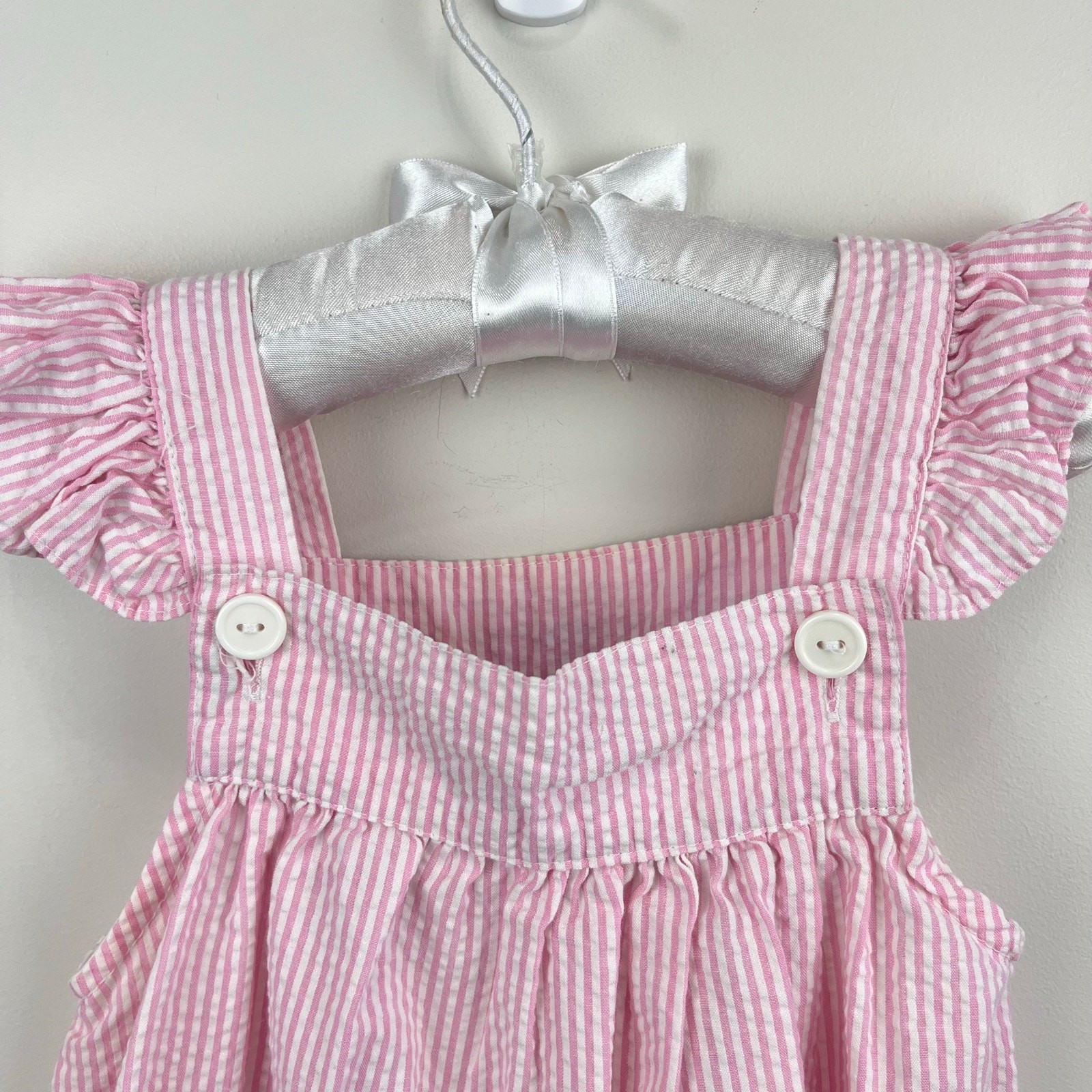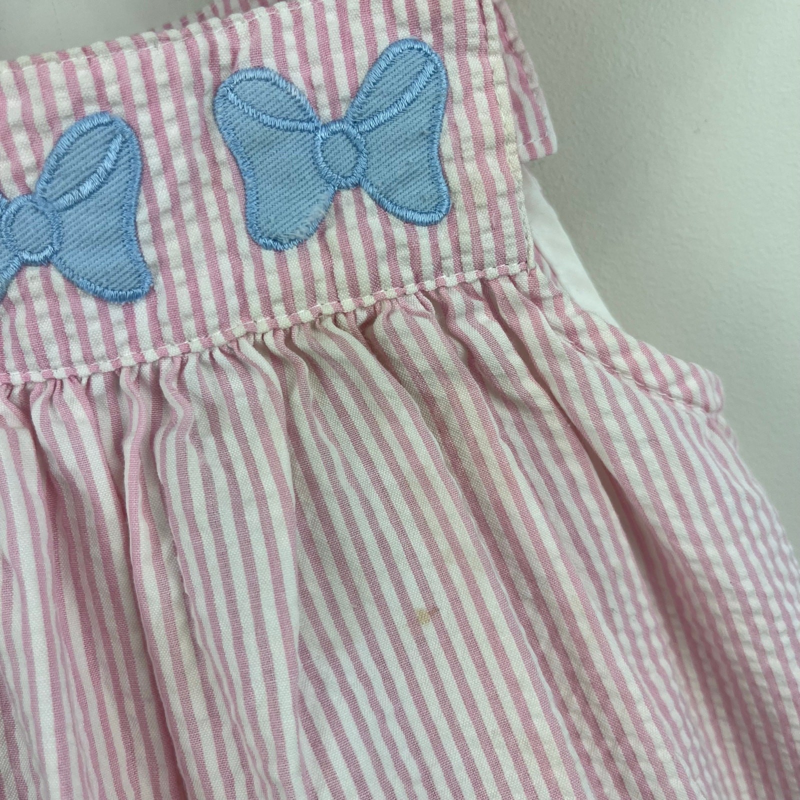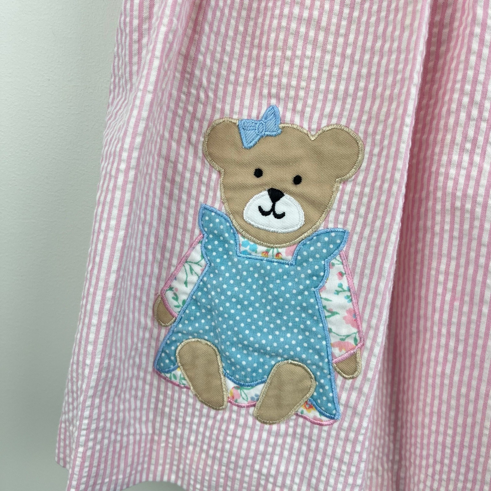 как выглядит Vintage Samara Pink Seersucker Teddy Bear Bow Pinafore Dress 24 Months фото