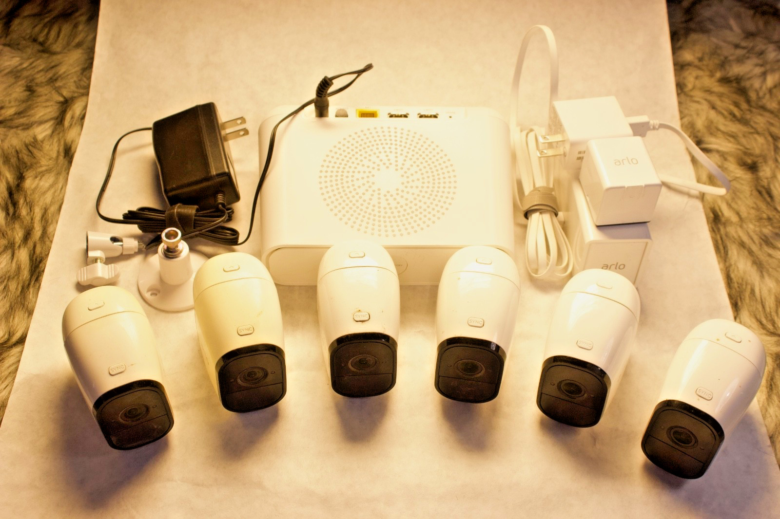 Arlo Pro Model VMB4000 security camera system: 6 pack, charger, cords, batteries