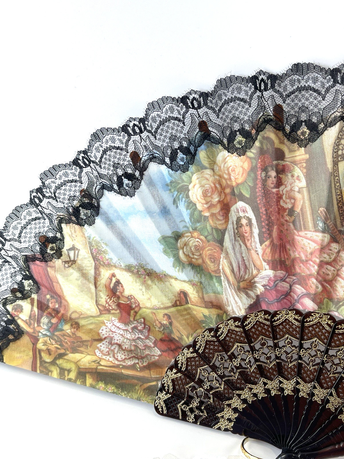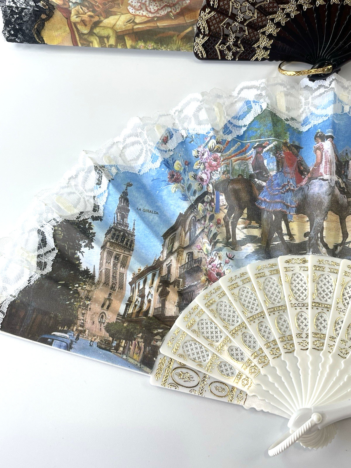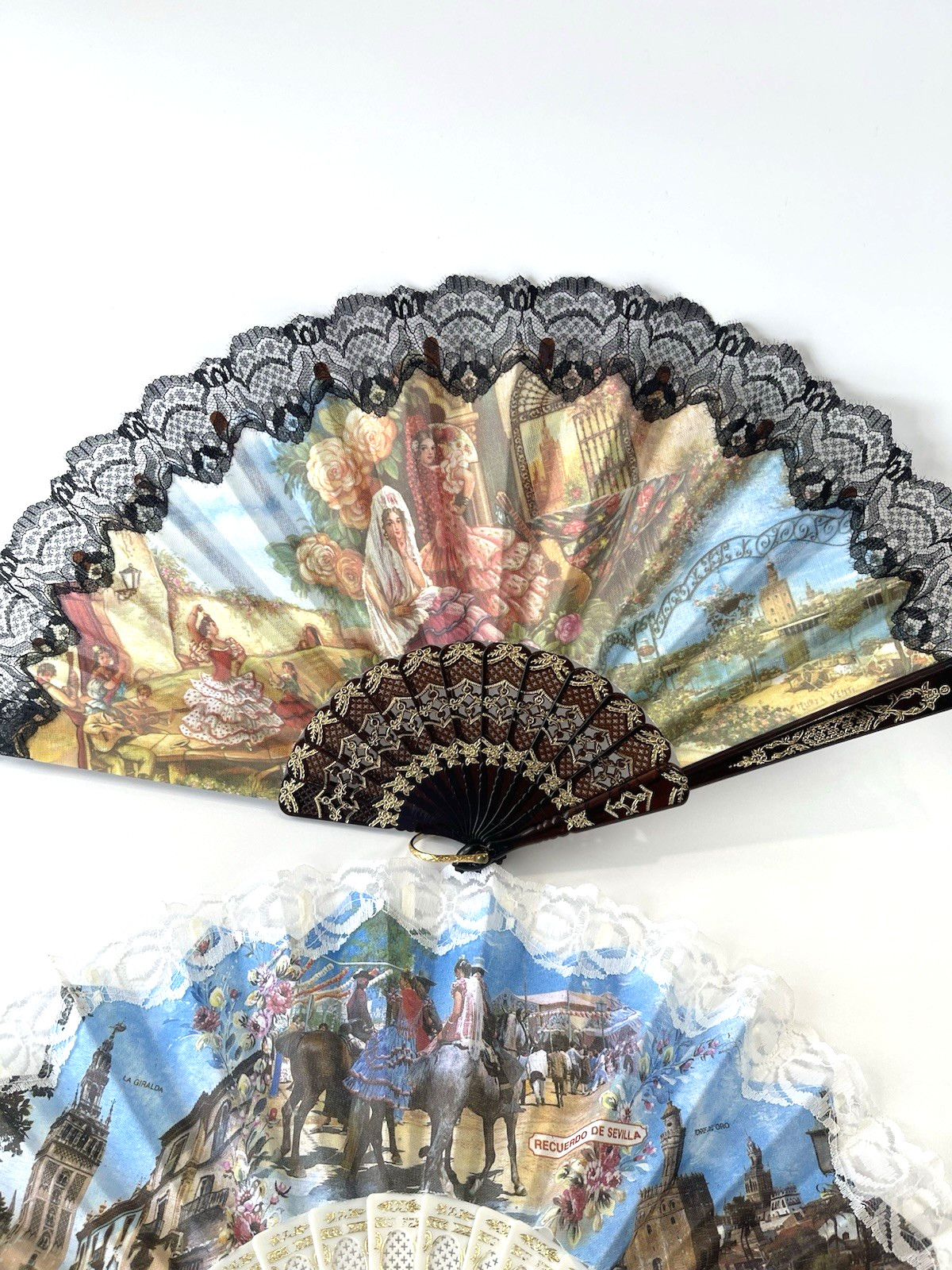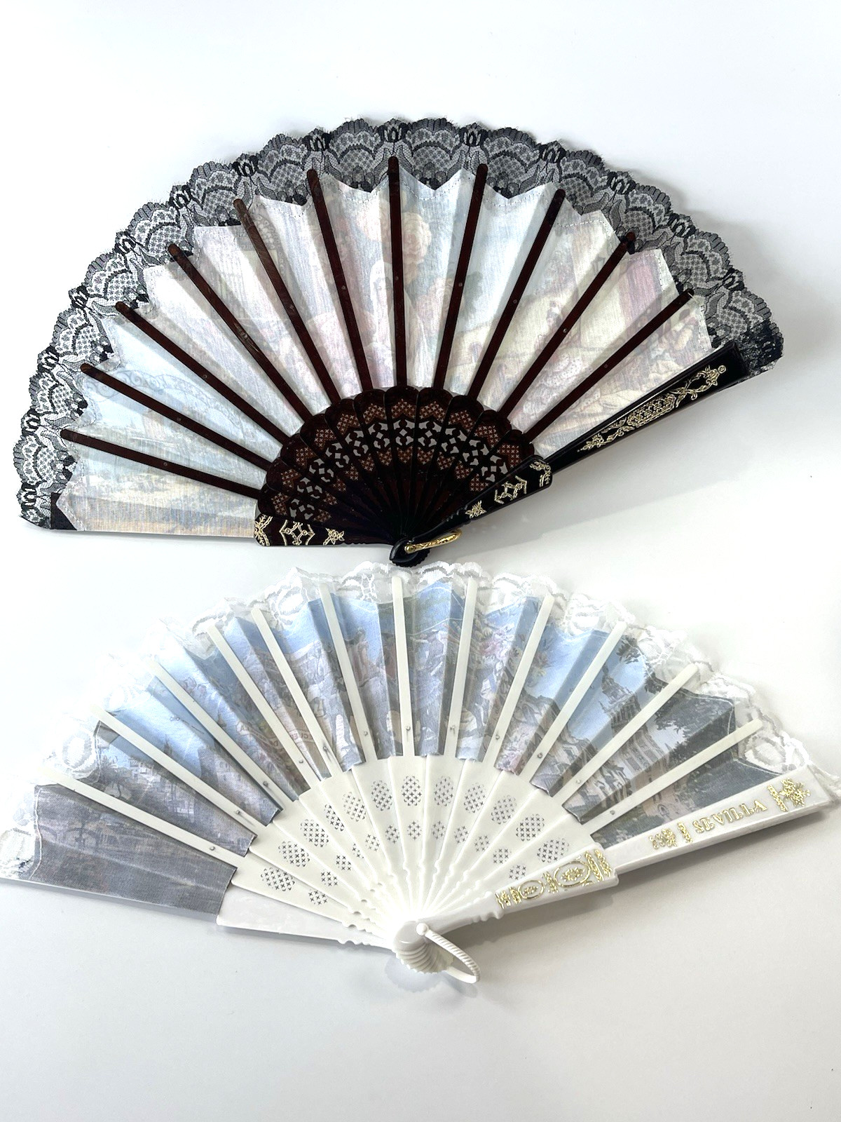Vintage Spanish Folding Hand Fans Black White Lace Sevilla Souvenir Set of 2