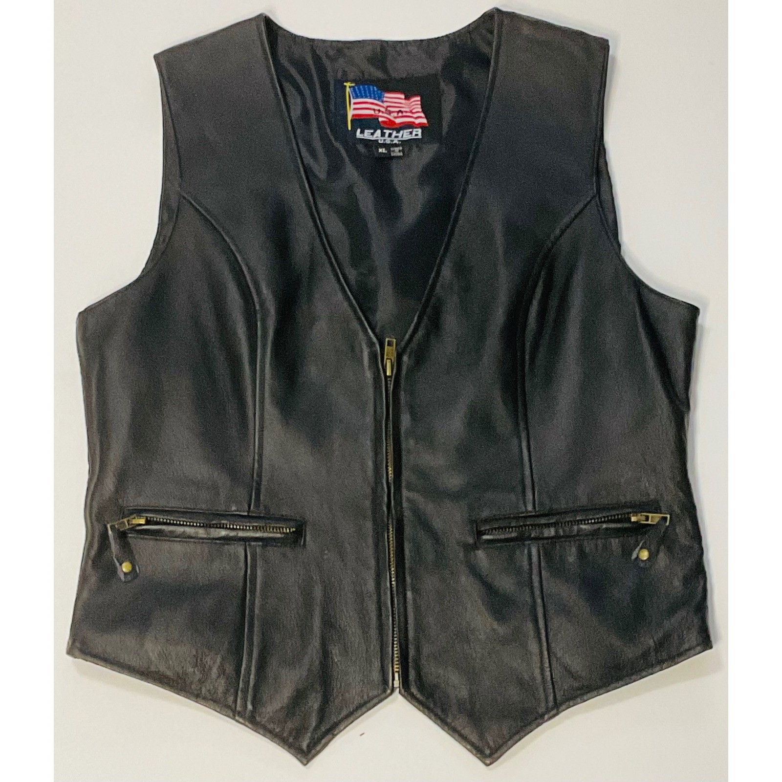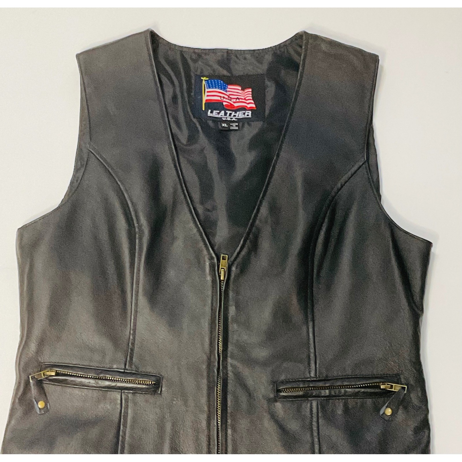 U.S.A.men's genuine leather biker motorcycle vest black pockets Stretch MOTO XL