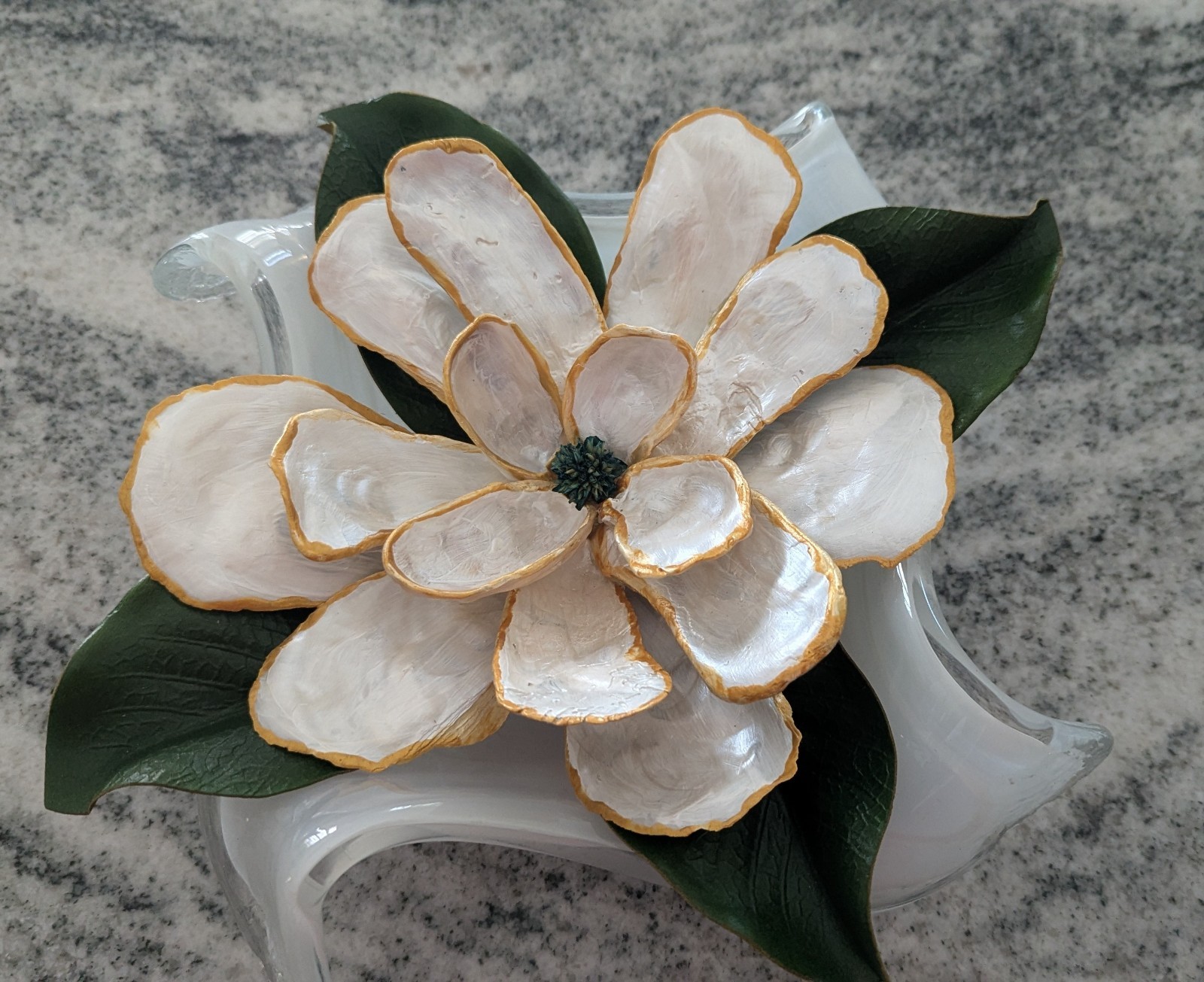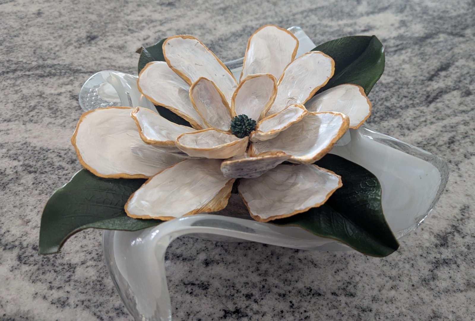 как выглядит Oyster Shell Magnolia Flower In Glass Bowl фото