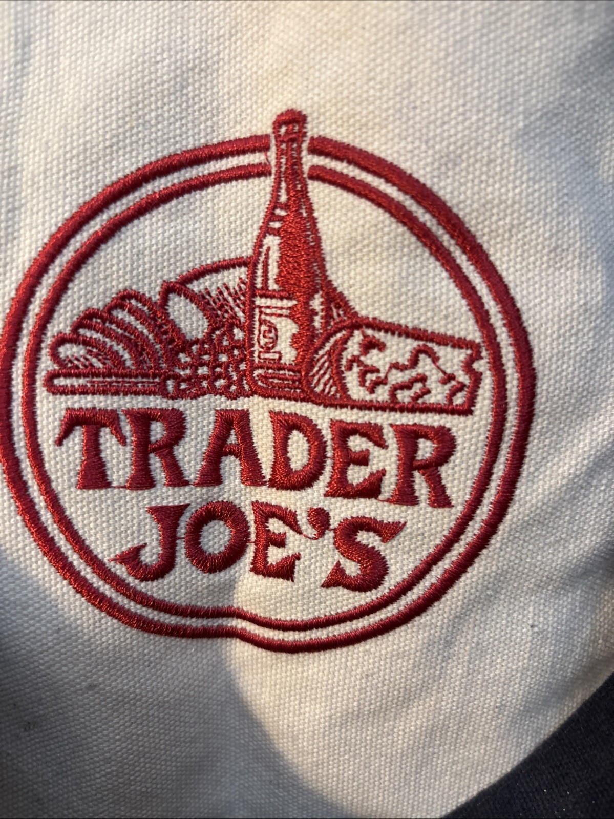 Trader Joe s X-large canvas tote bag blue handles And Embroidered Pockets In Red