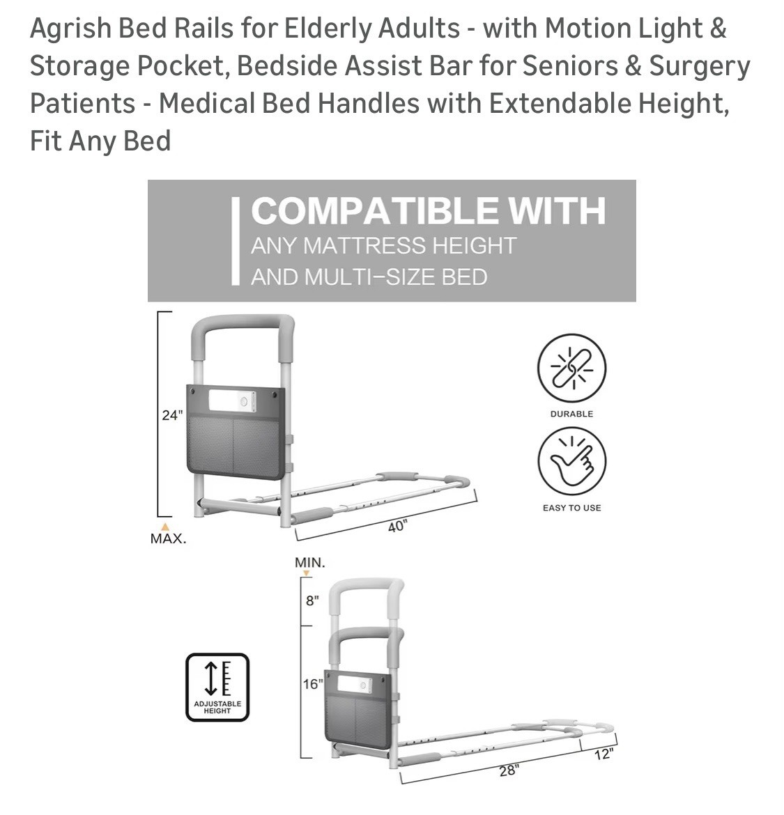 Bed Rails for Elderly Adults Safety with Motion Light Storage Pouch - Medical