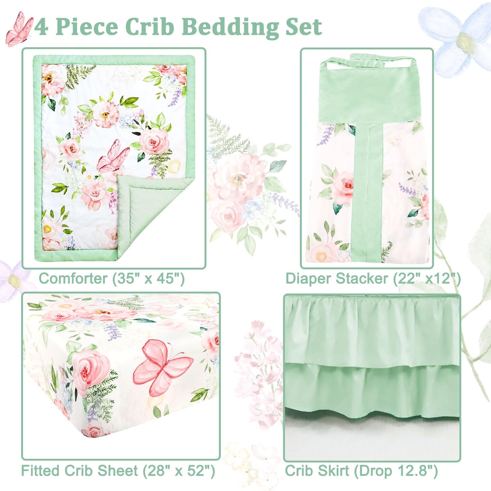 4-Piece Crib Bedding Set, Baby Girl Crib Bedding Set Butterflies Floral Nurse...