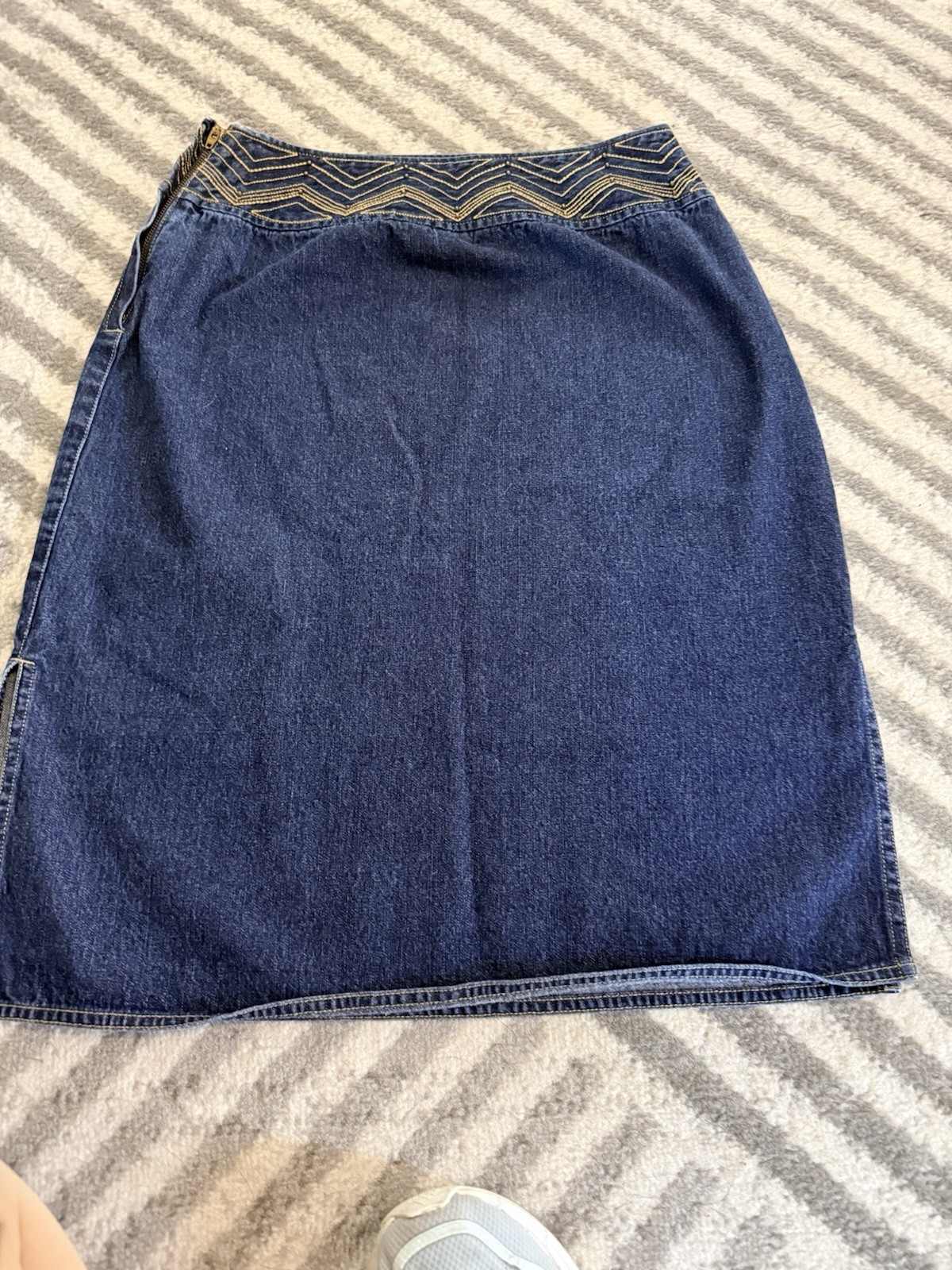 как выглядит Liz Claiborne Blue Denim Jean Skirt A-Line Embroidered Side Slit Size 6 Vintage фото