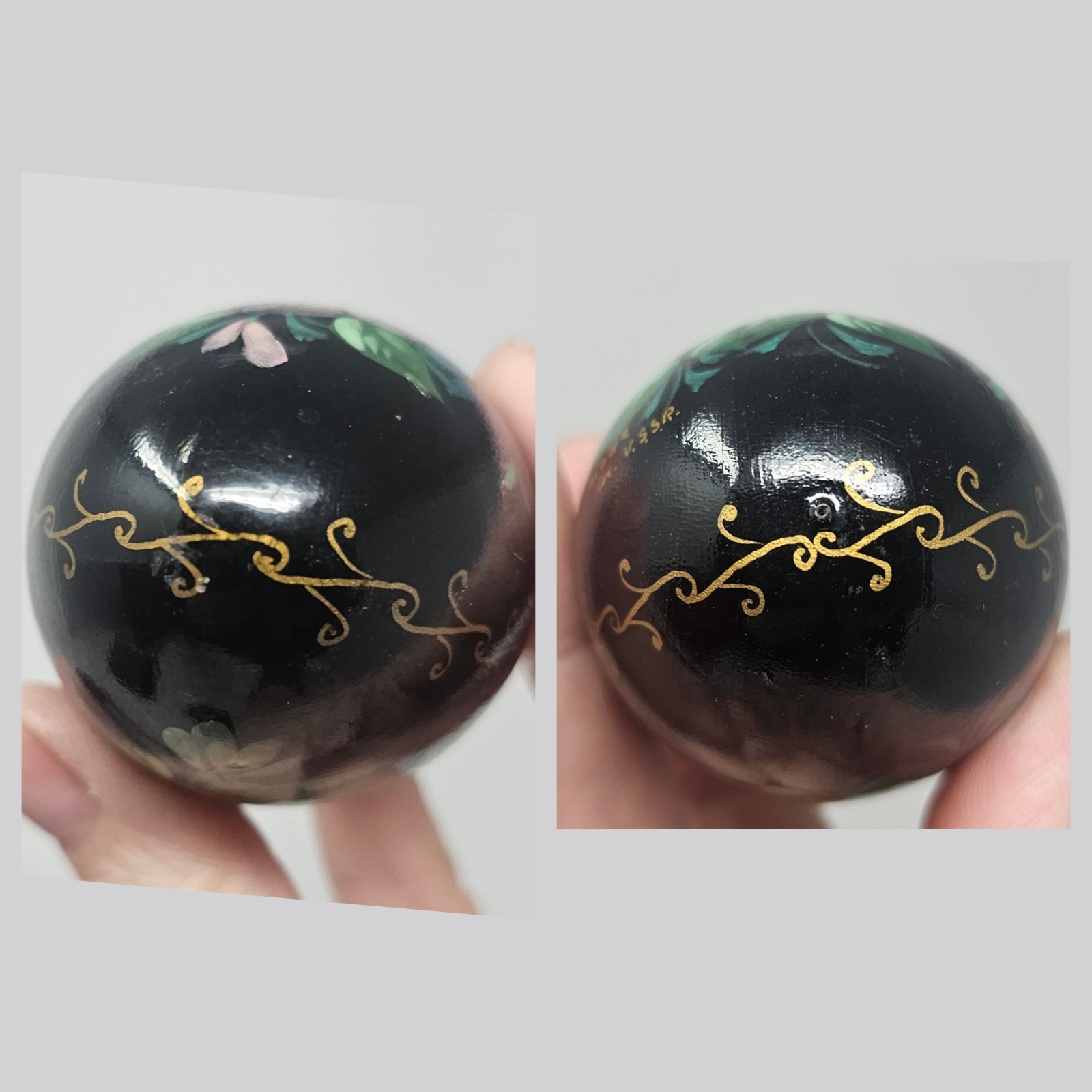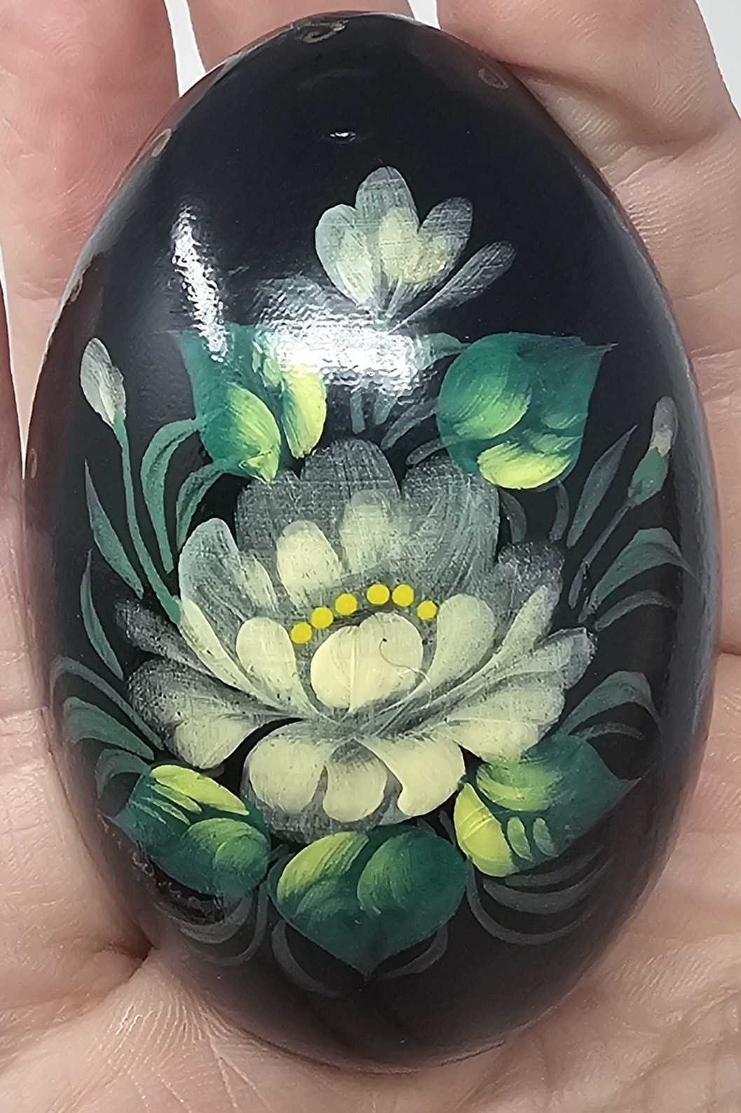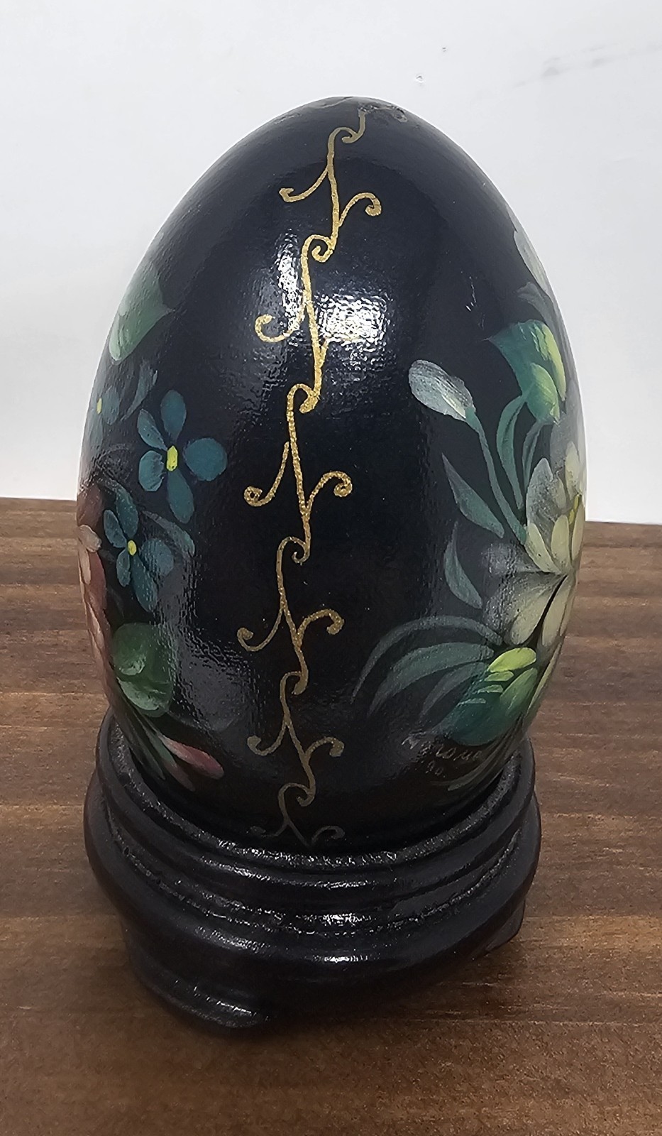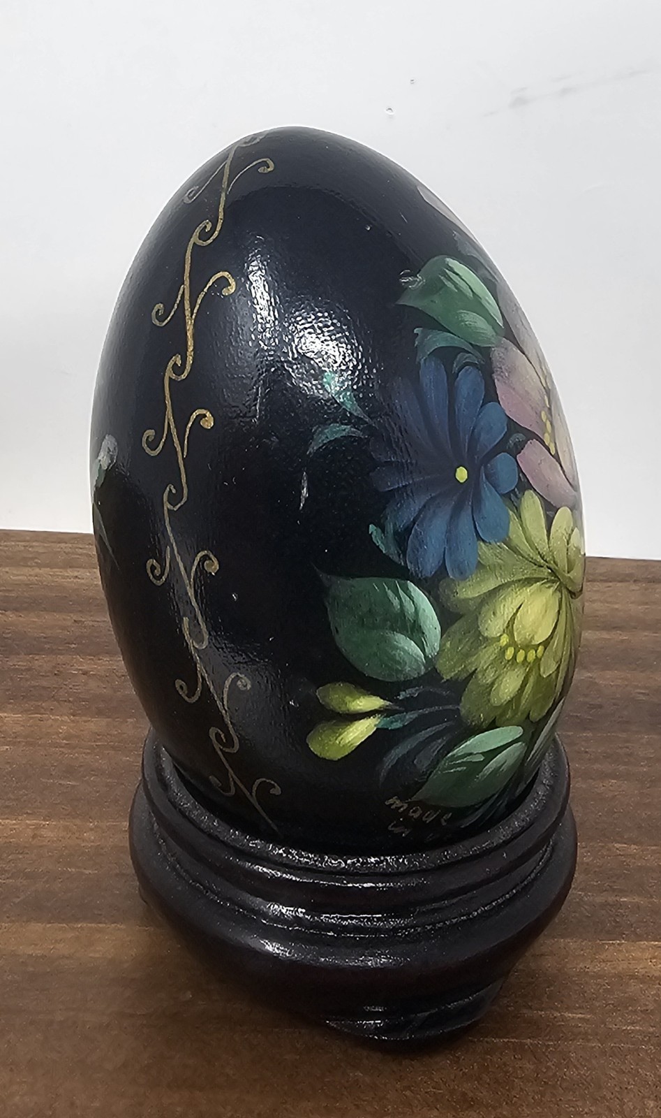 • Hand Painted U.S.S.R Russian Solid Wood Lacquered Floral Egg With Stand Signed