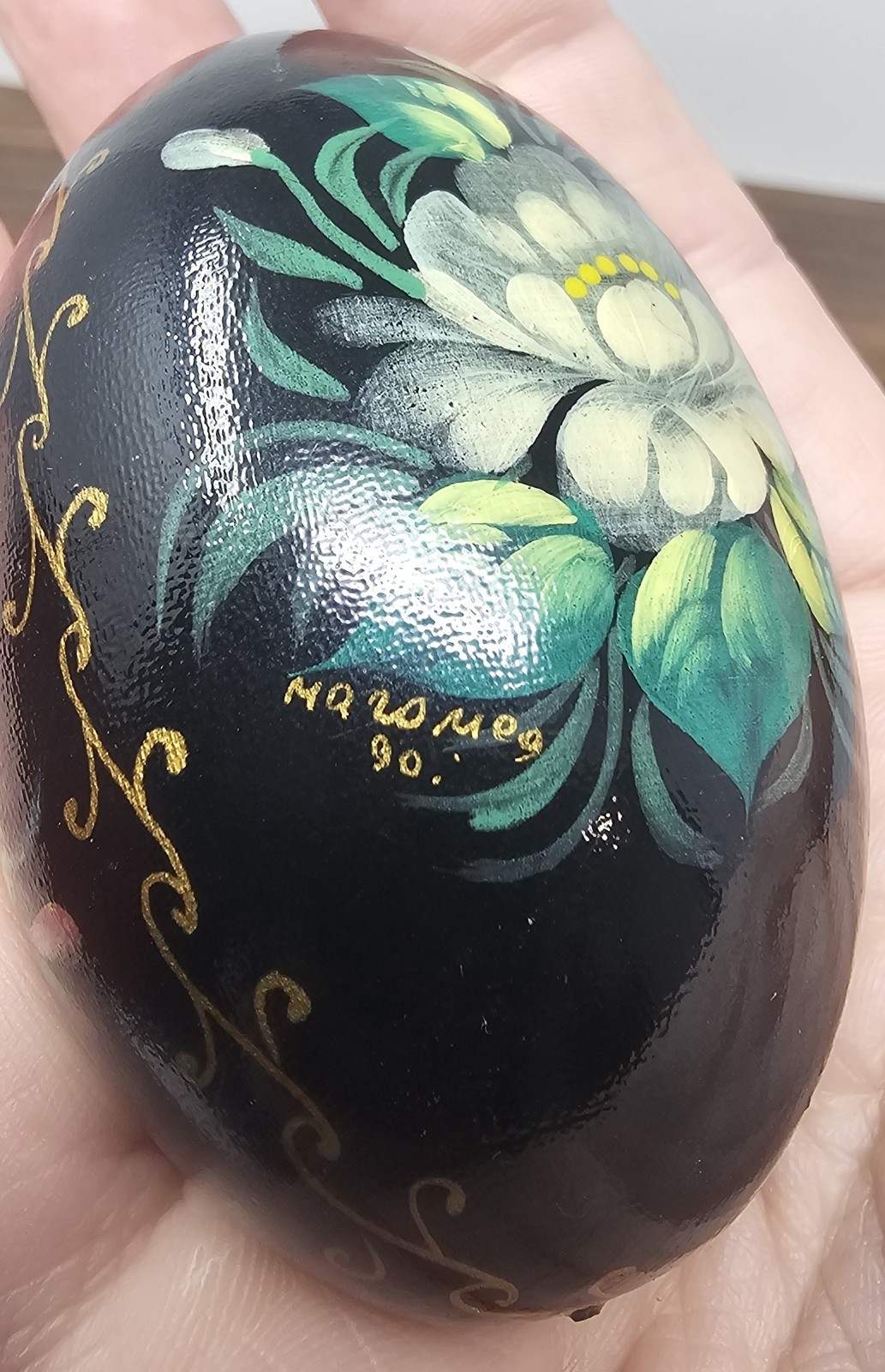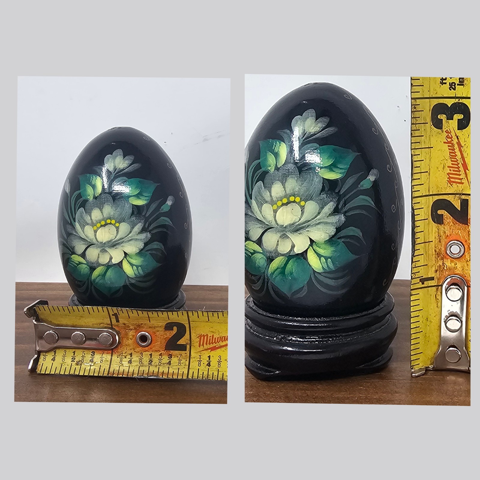 как выглядит Hand Painted U.S.S.R Russian Solid Wood Lacquered Floral Egg With Stand Signed фото