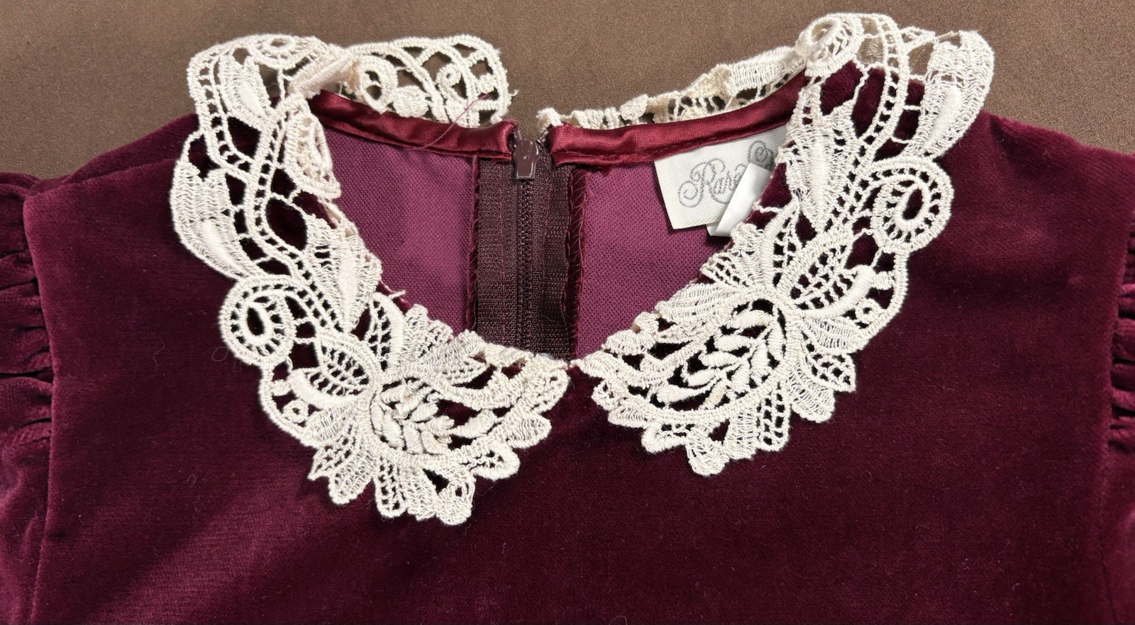Rare Editions Vintage Girls Velvet Burgundy Lace Collar Dress Long Sleeve 8