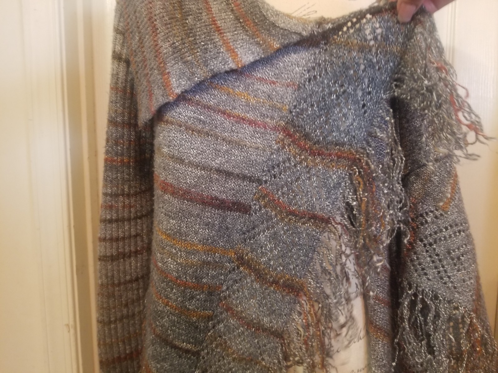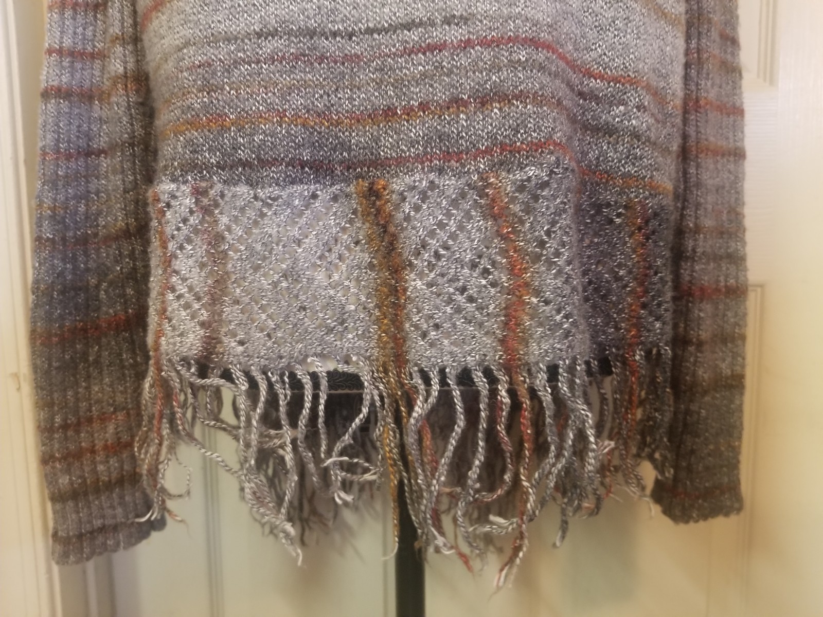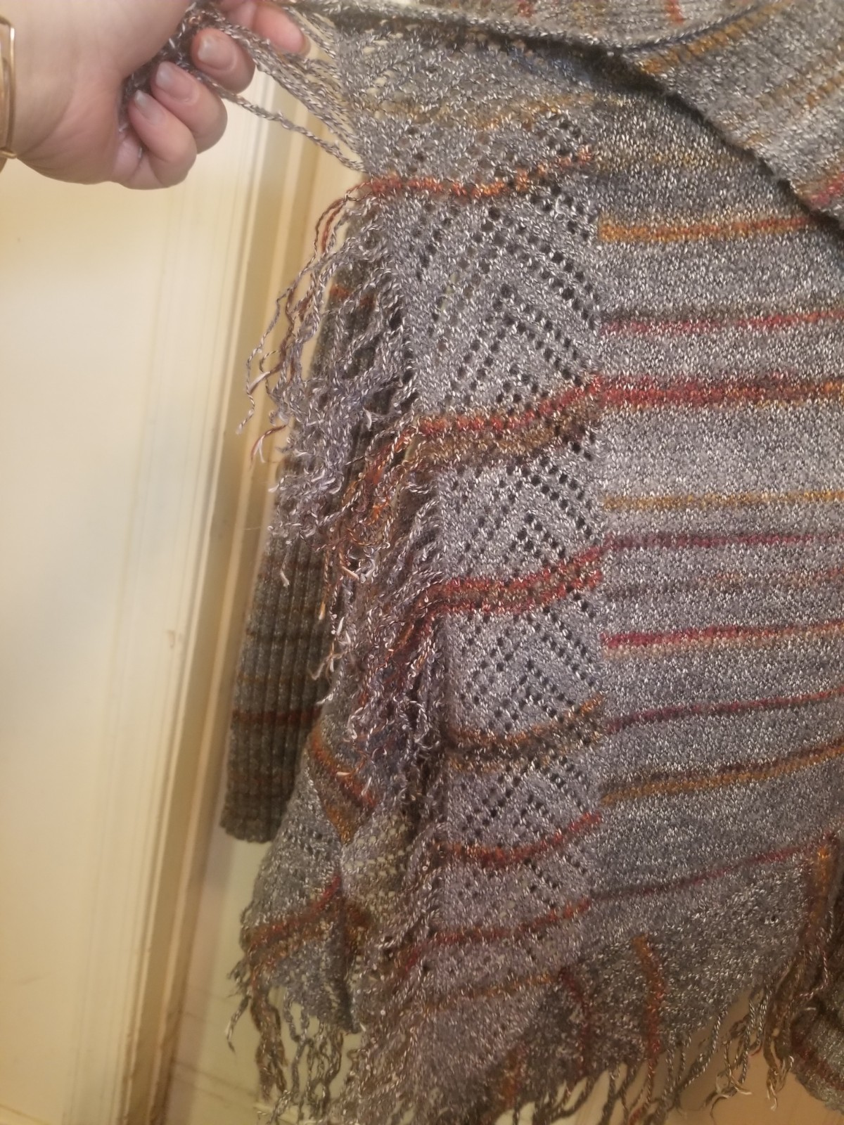 Cato LSlv Cardigan Large Gray Brown Stripes Collared Open Crossover Front Fringe
