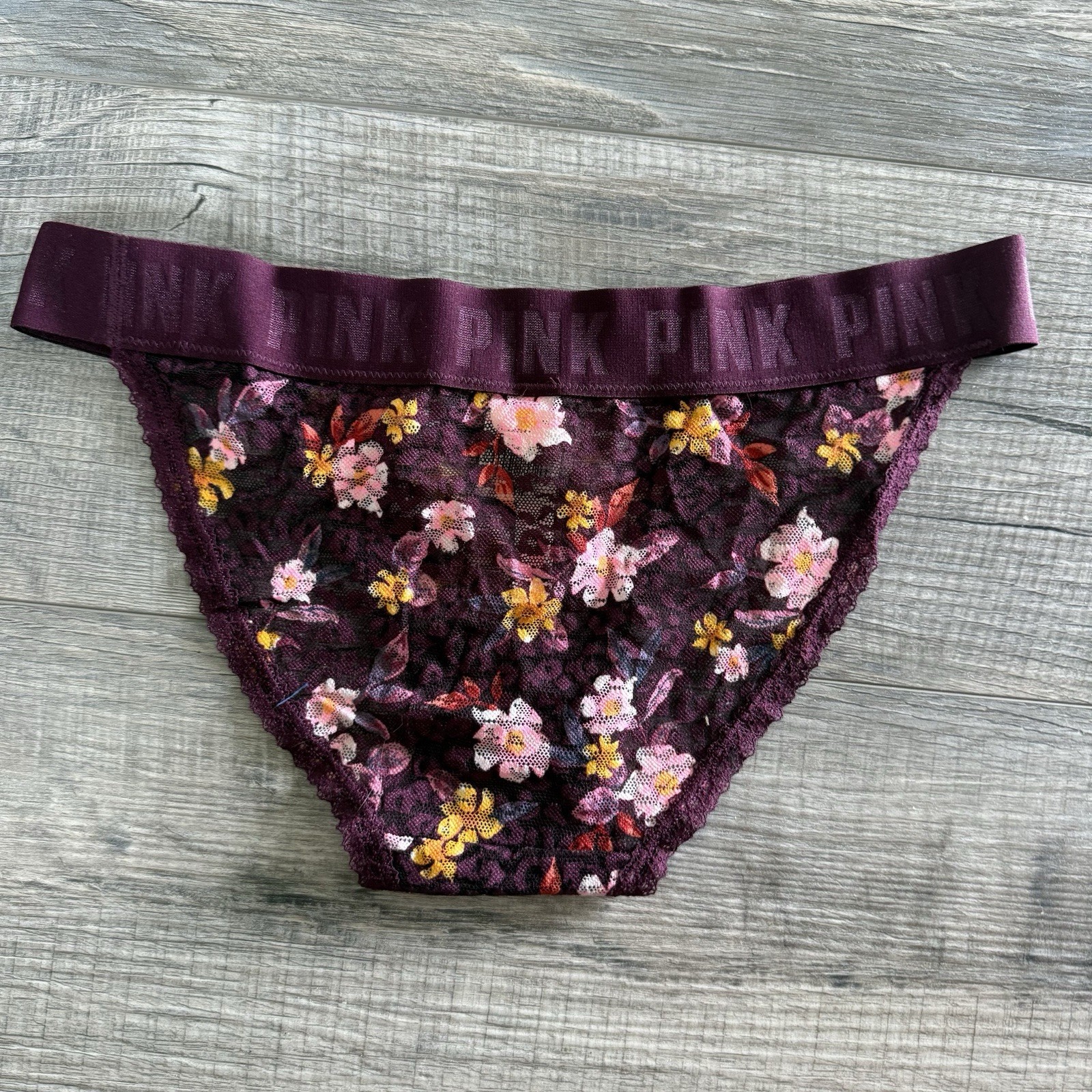 как выглядит NWT VICTORIAS SECRET LACE THICK LOGO BAND RARE BIKINI PANTIES Medium Floral фото