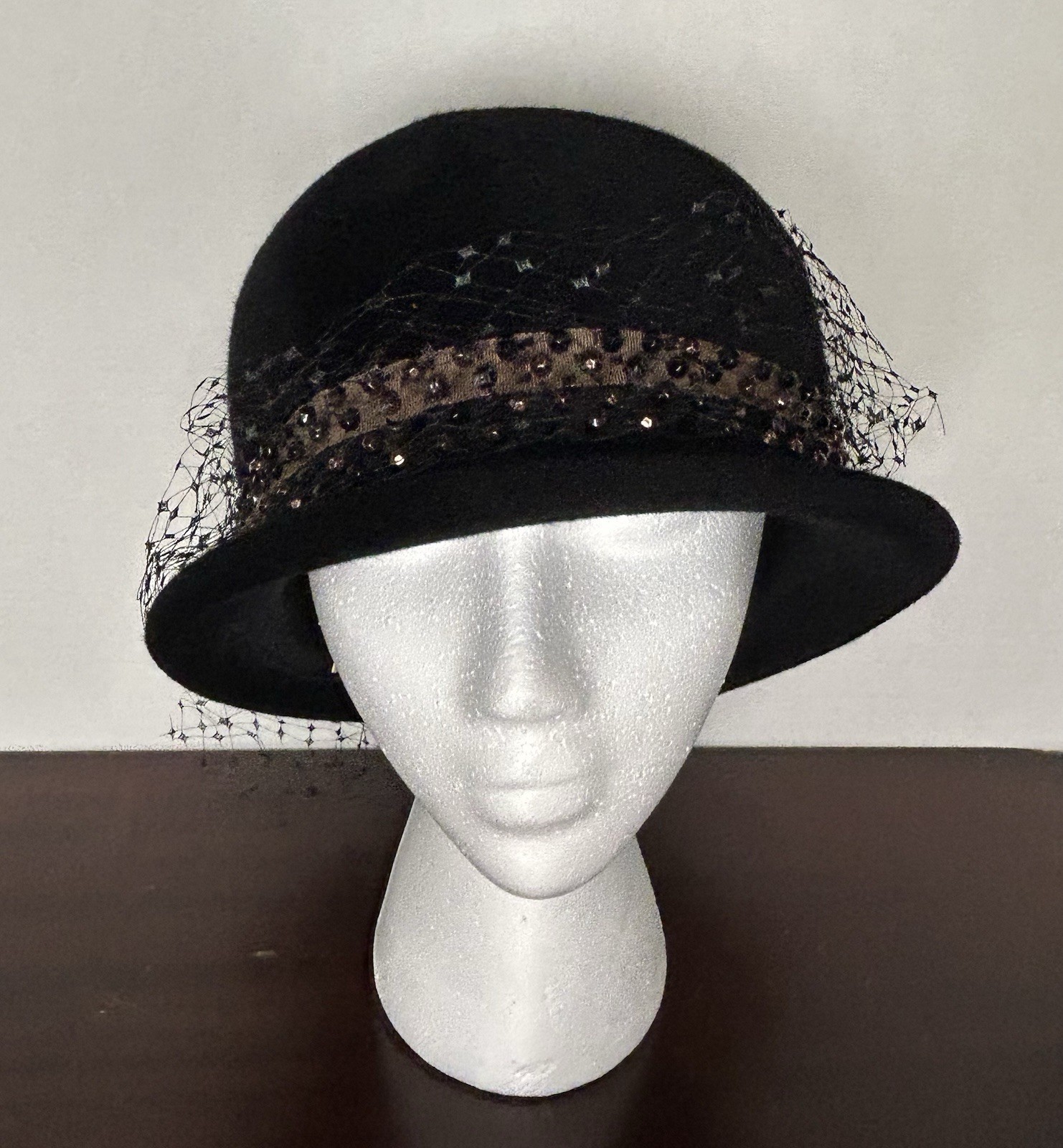 Mr.John Jr Elegant Black Cloche Hat With Netting And Beaded Trim