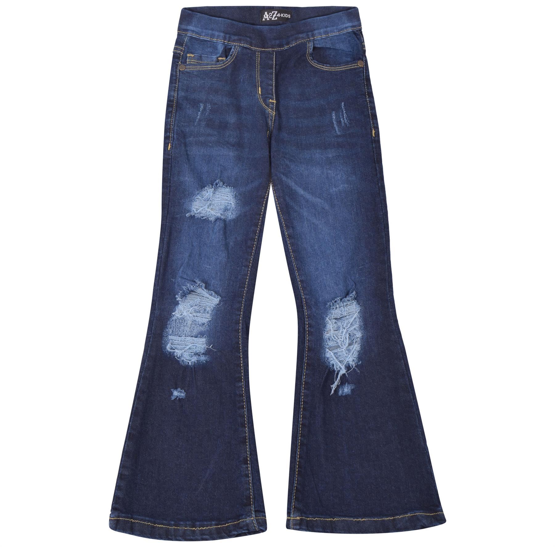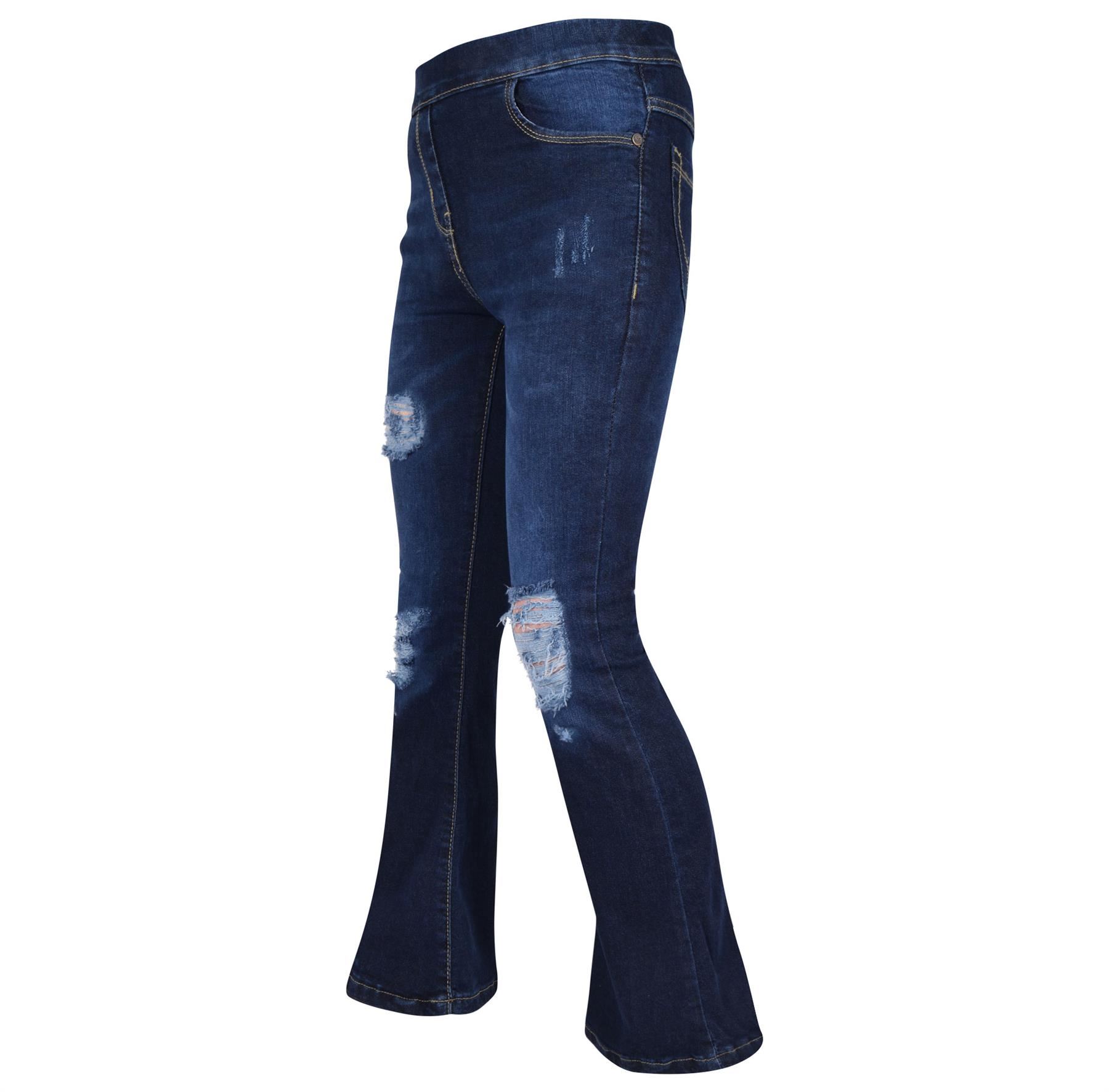Kids Girls Denim Jeans Comfort Stretchy Flared Bell Bottom Dark Blue Ripped Pant