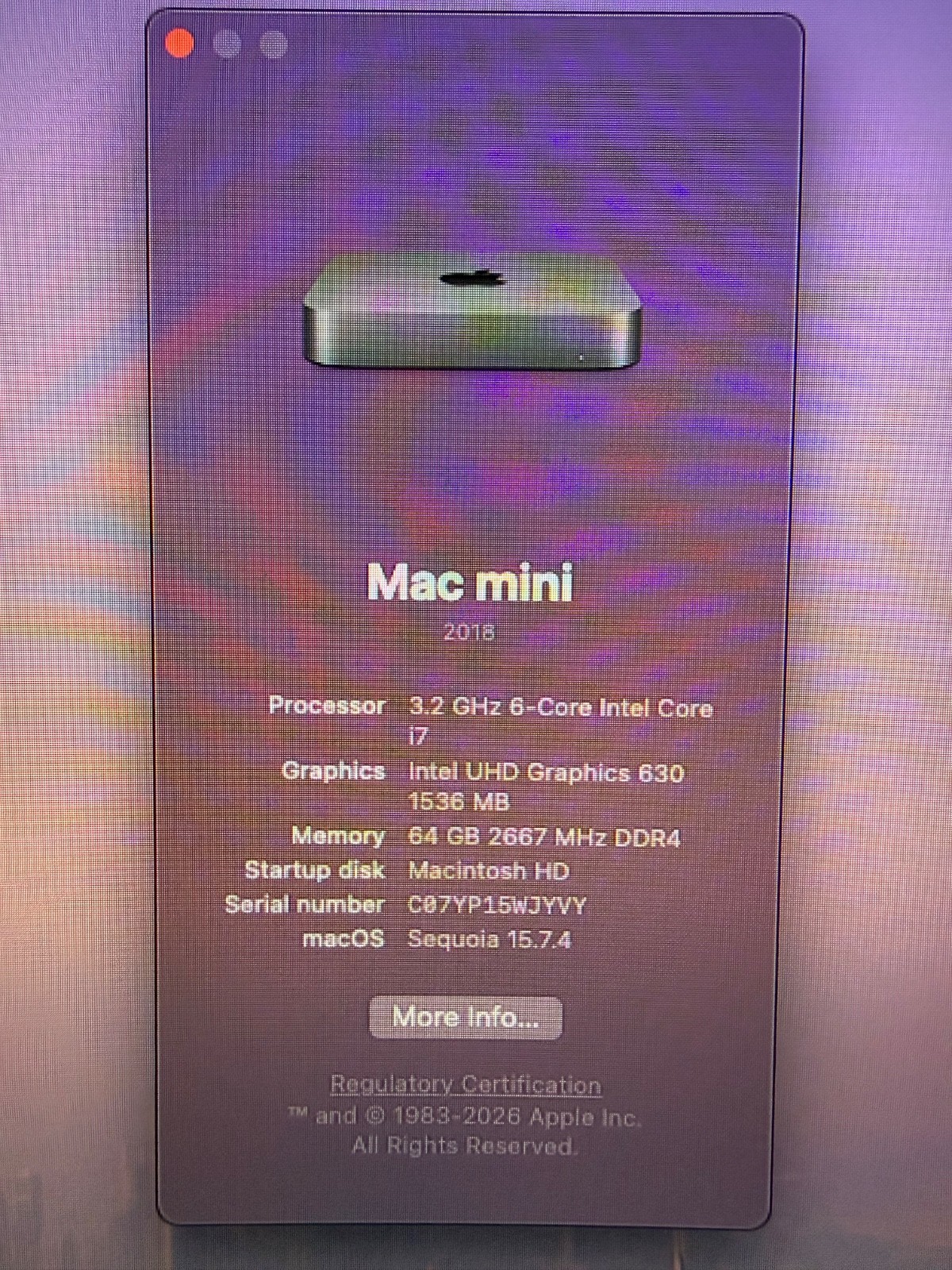 2018 Mac Mini a1993, i7 3.2GHz 6-core, 64GB RAM, 512GB SSD