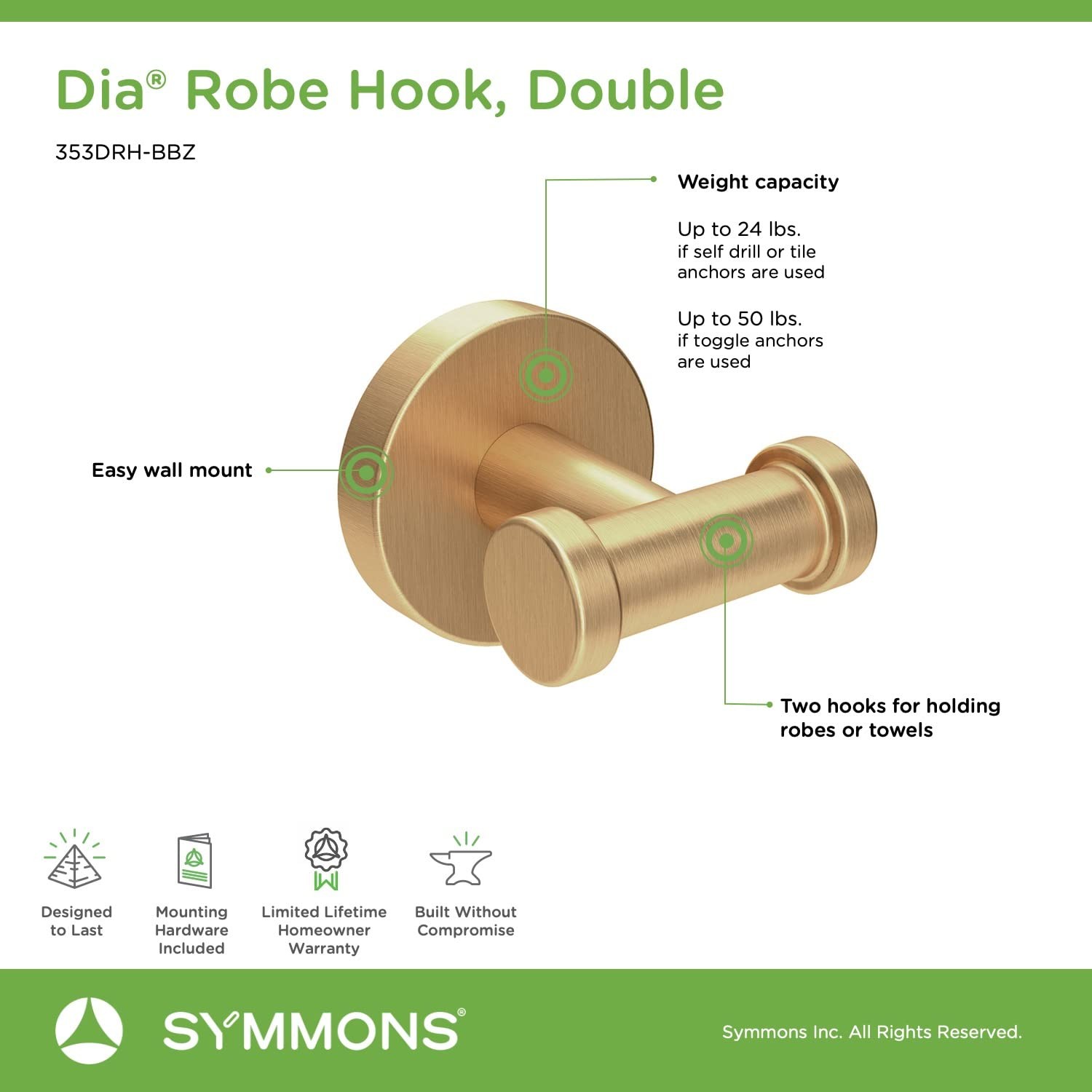 353DRH-BBZ Dia Wall-Mounted Double Robe Hook in Brushed Bronze, Size