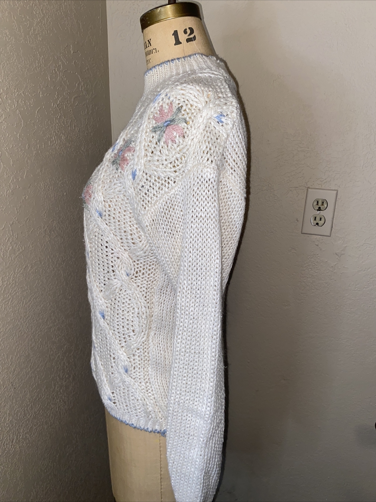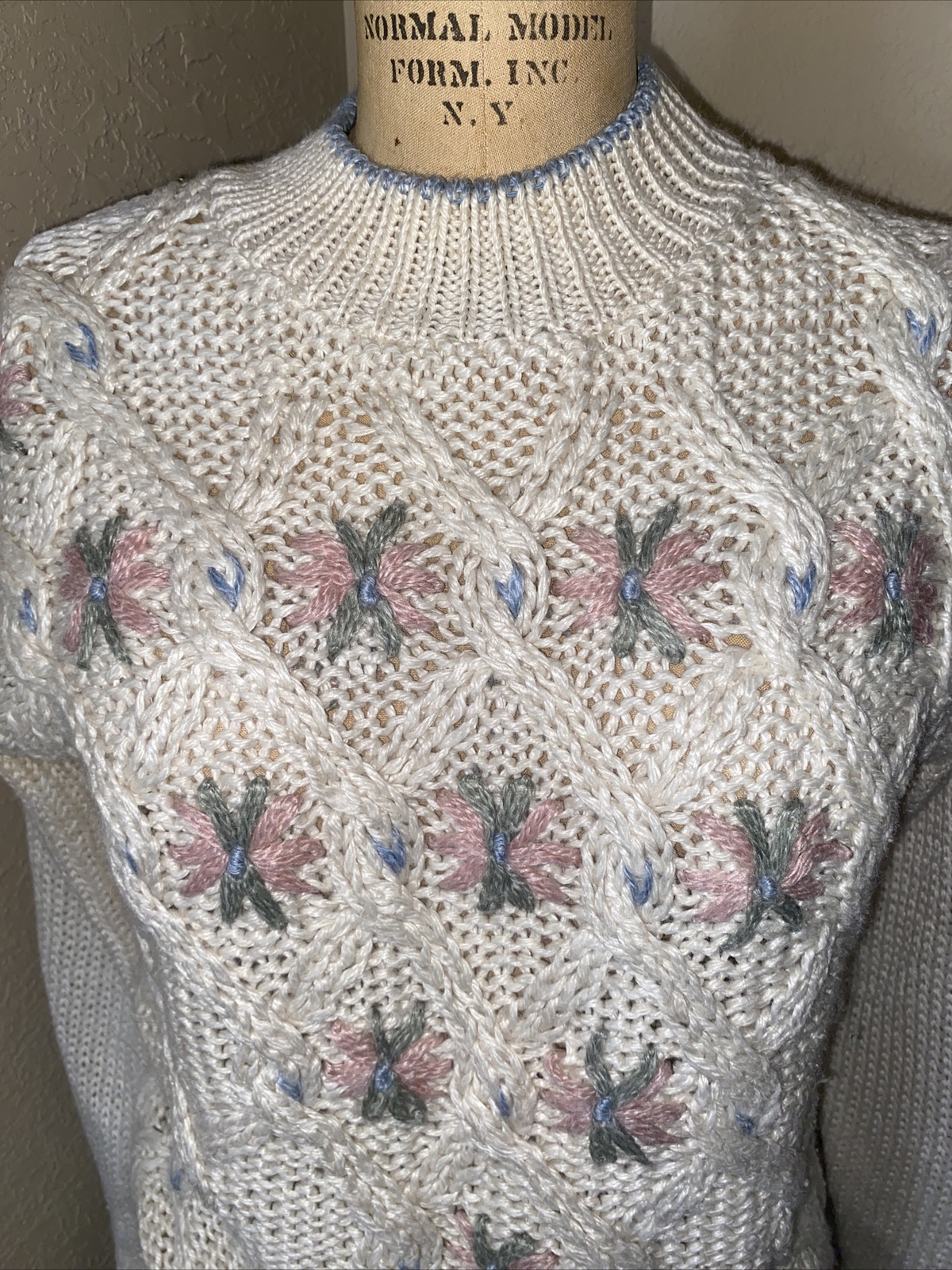 как выглядит Vintage American Weekend Chucky Knit Cream Sweater With Floral Embellishments SM фото