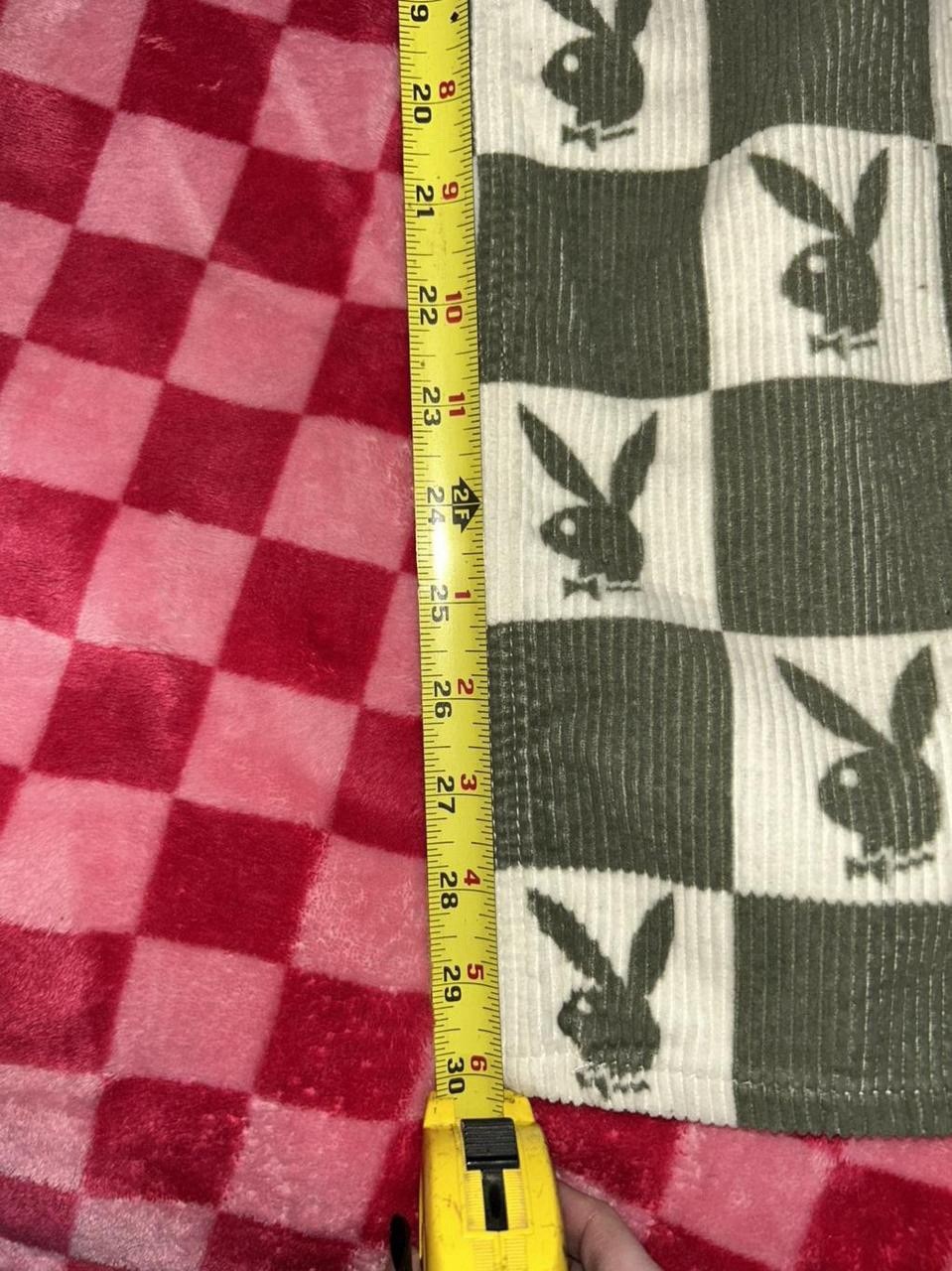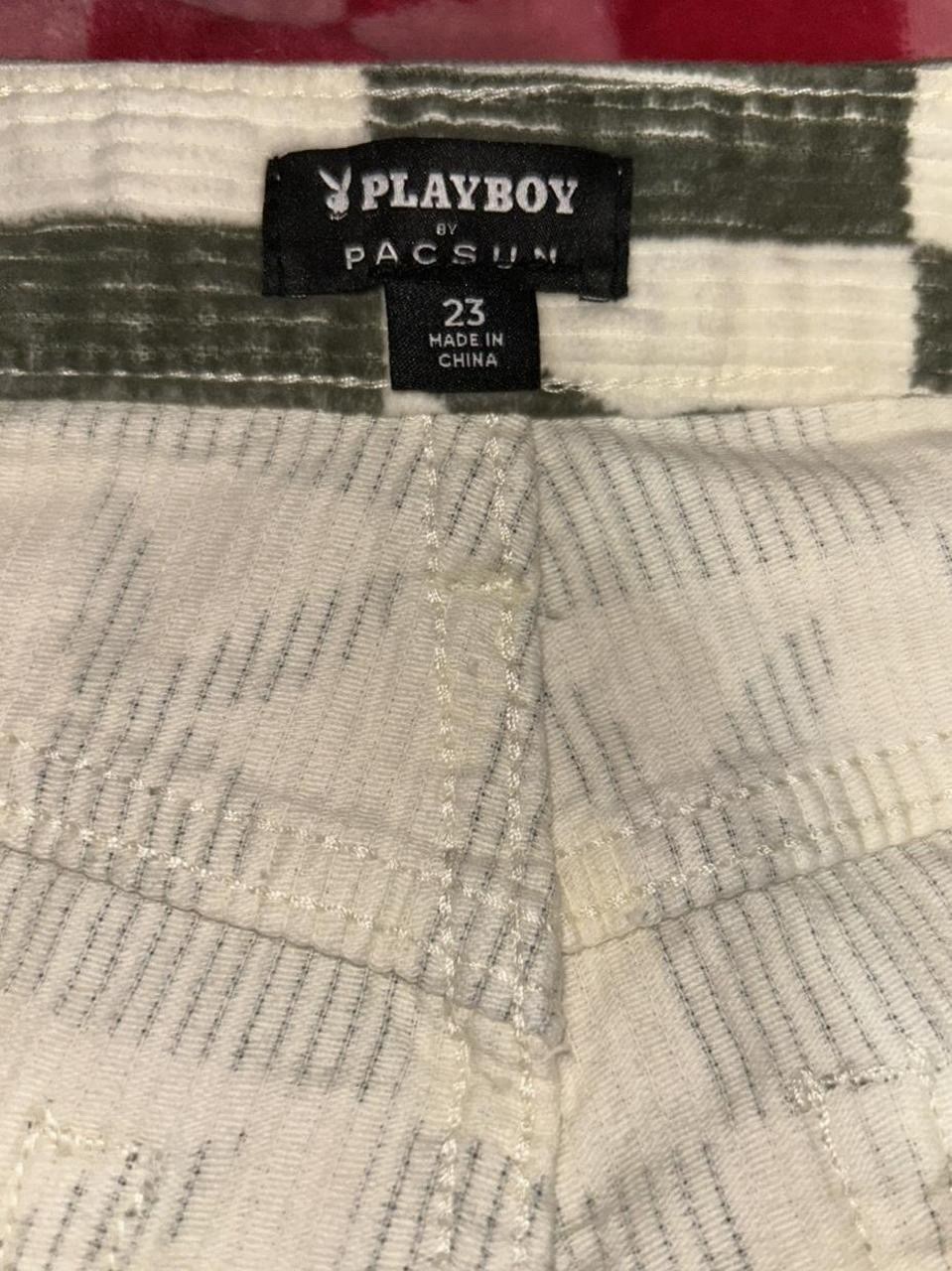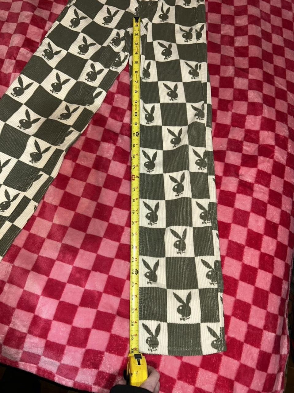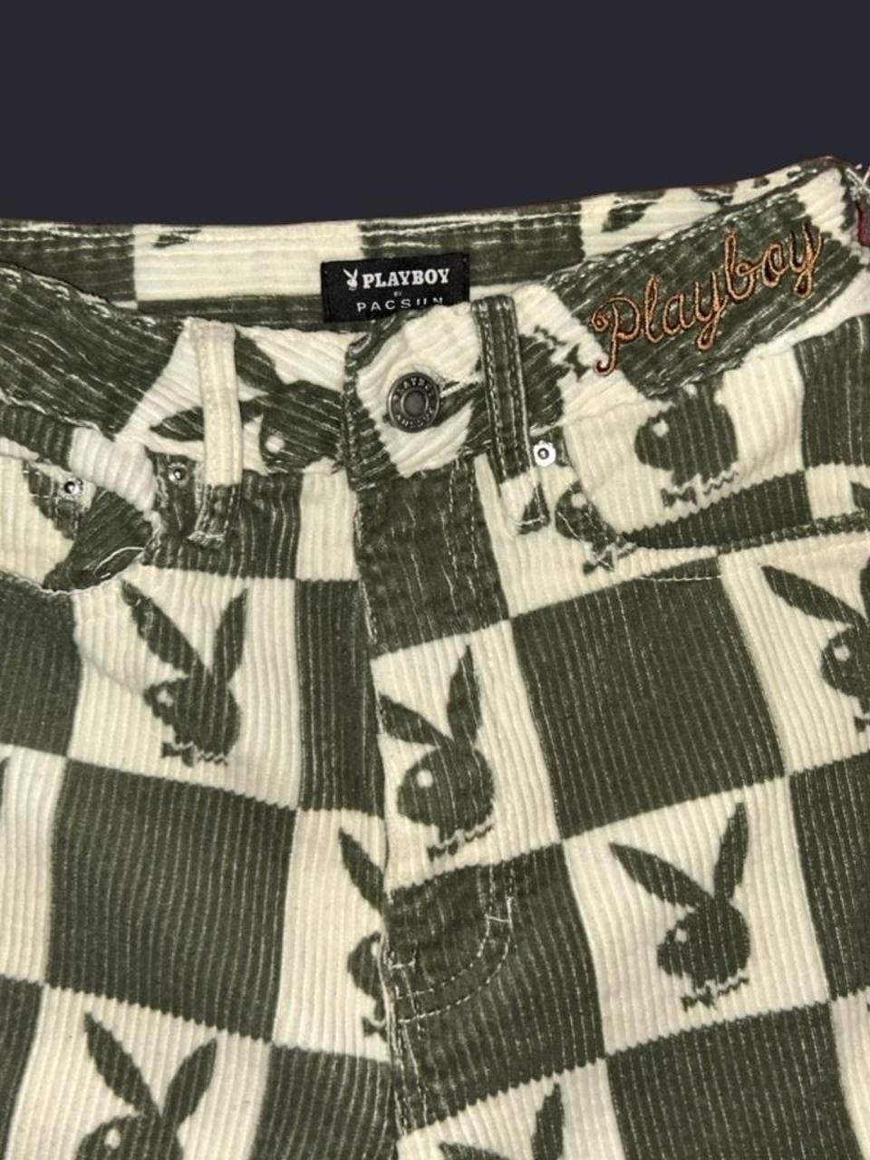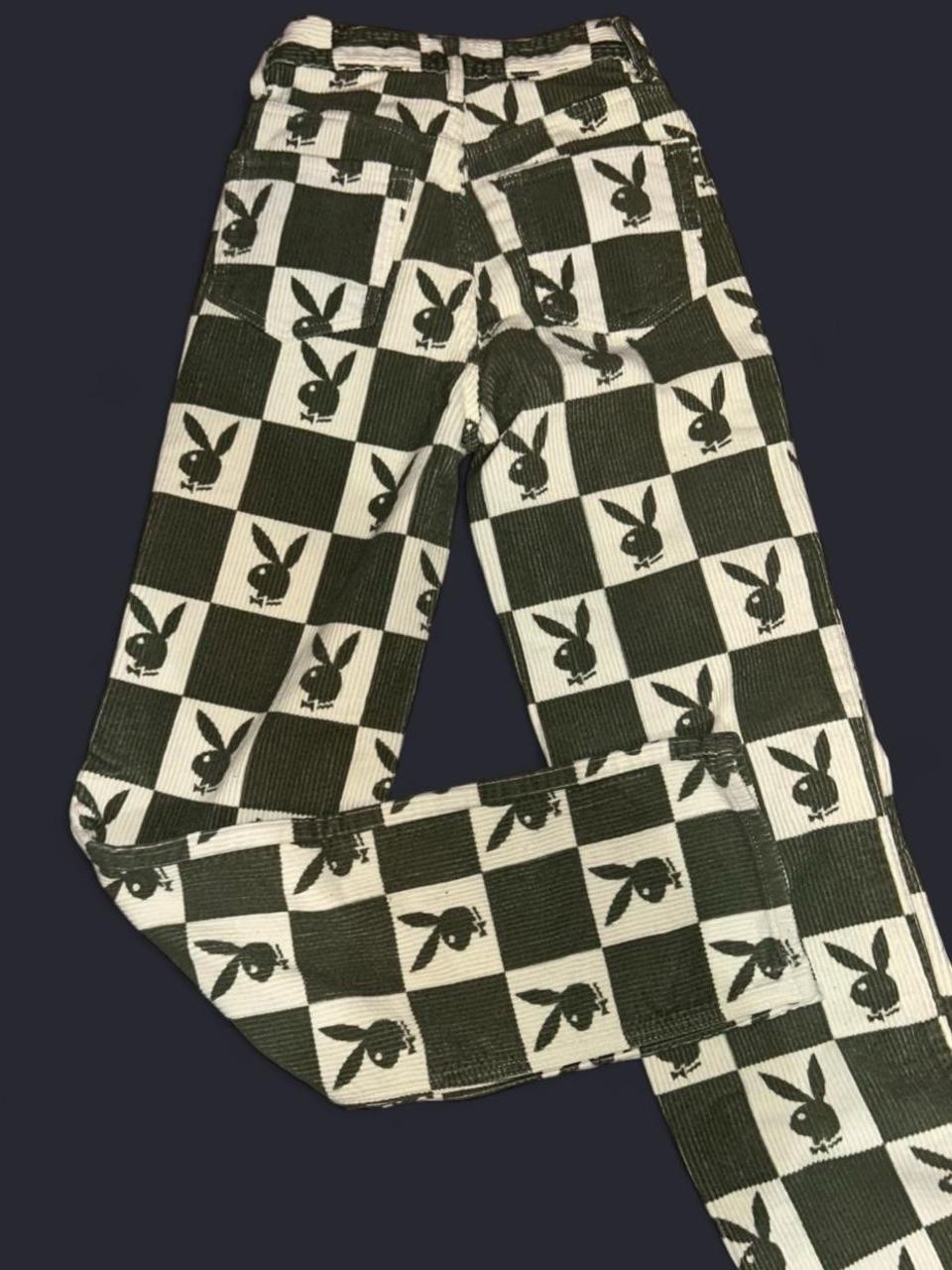 как выглядит Playboy x PacSun Womens Corduroy Check Straight Pants Green White Embroidered фото