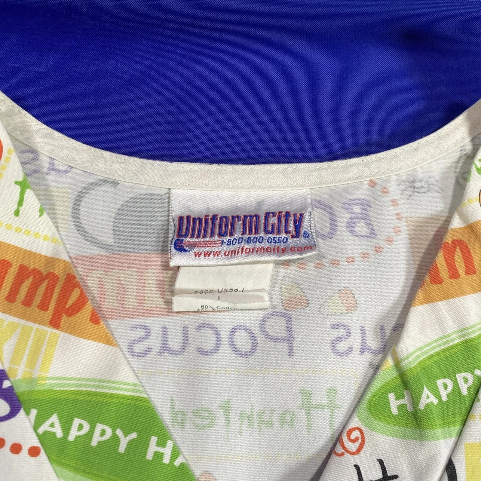 Halloween Scrub Top Women's Large V Neck Short Slv White Cats Pumpkins Novelty