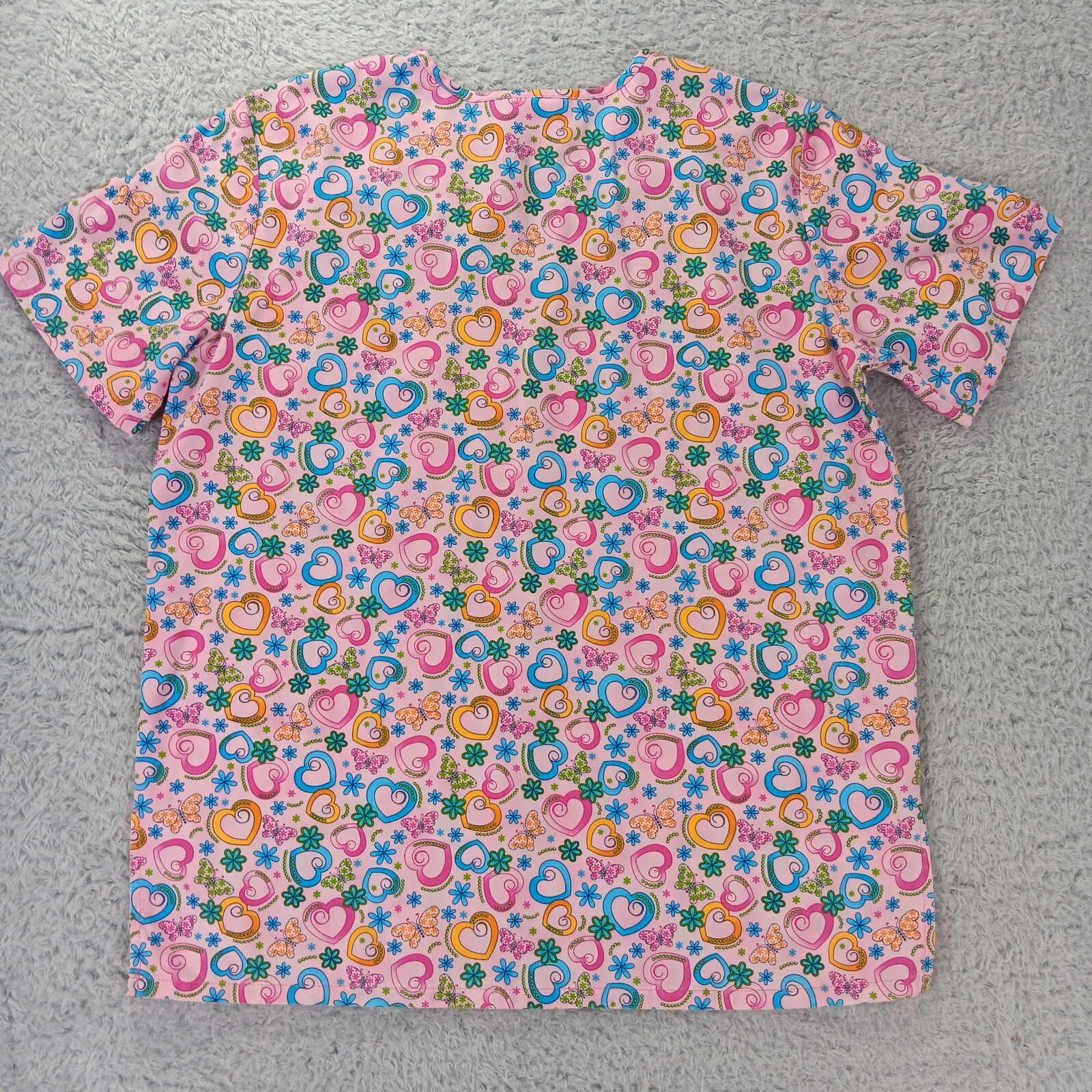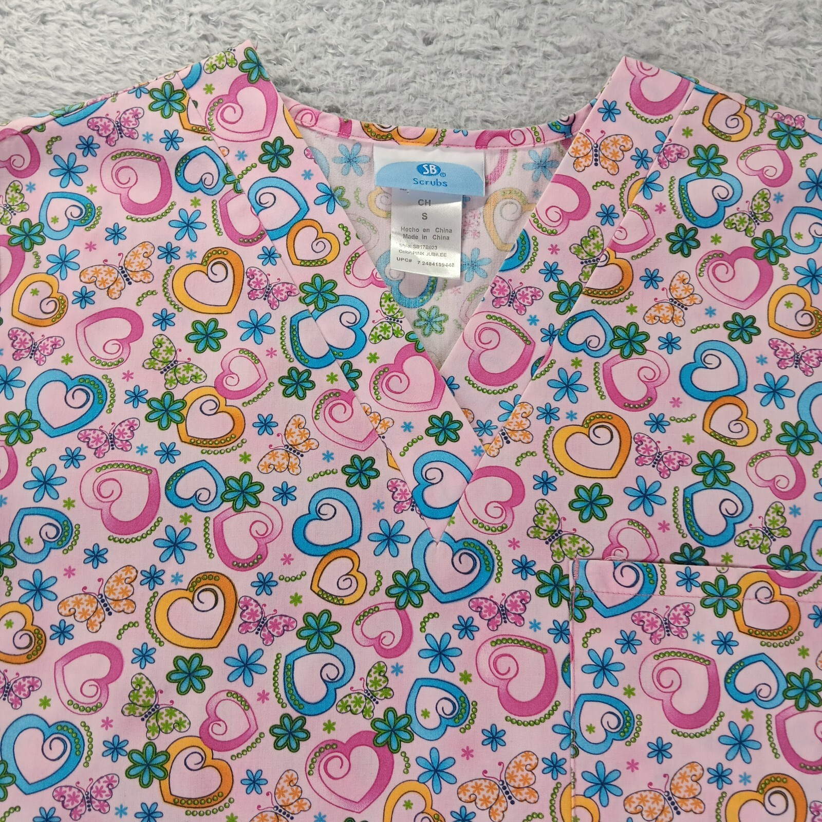 как выглядит SB Scrubs Scrub Top Womens Small Pink Hearts V-Neck Medical Floral SB17B923 фото