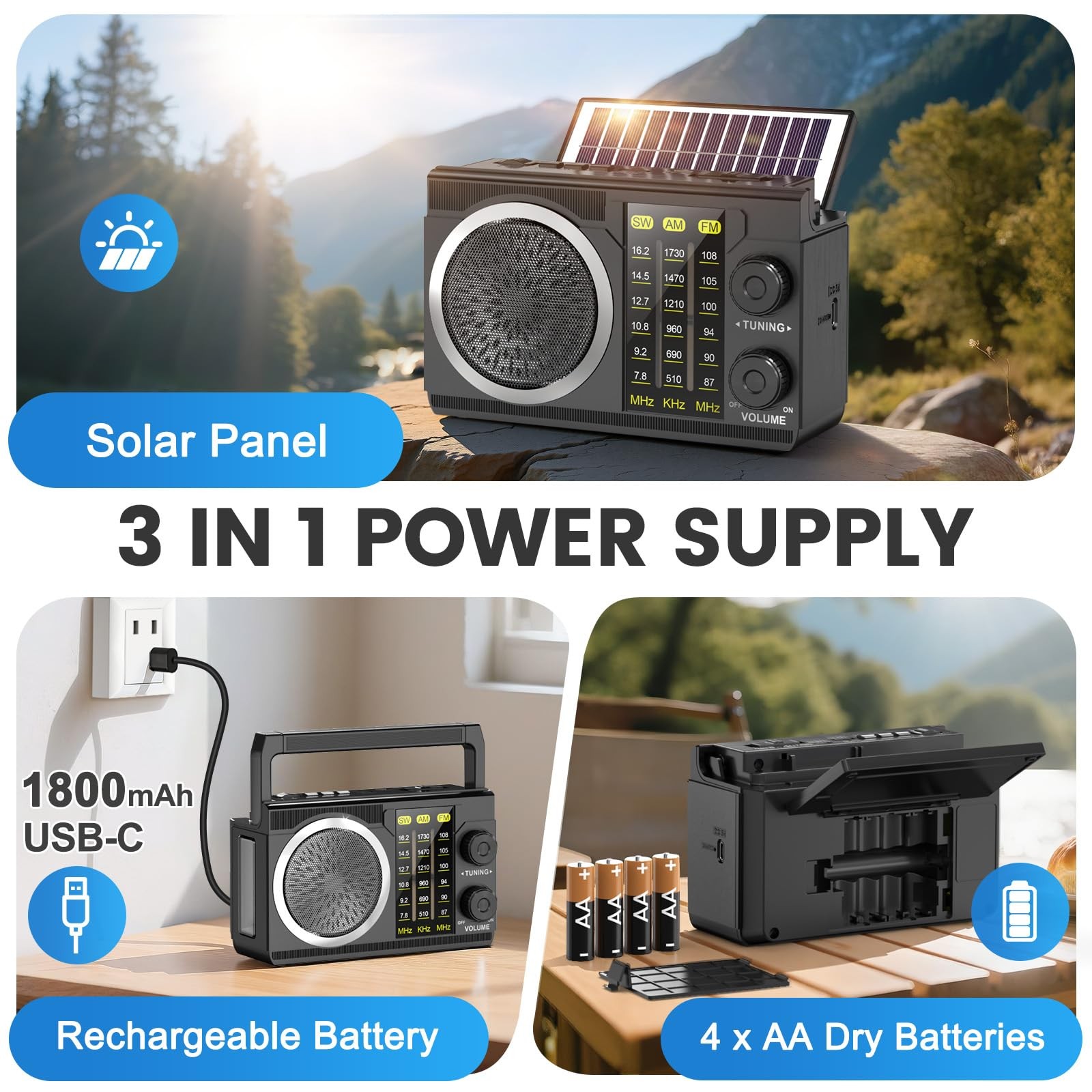 J-135 AM FM Radio Portable Bluetooth, Solar/AA Battery Operated/USB-C Recharg...