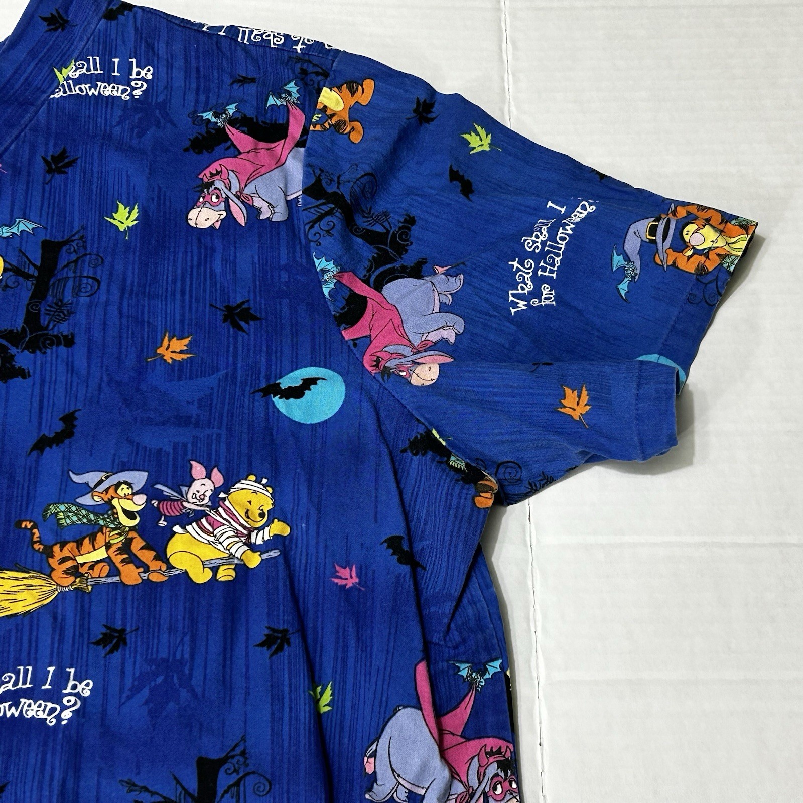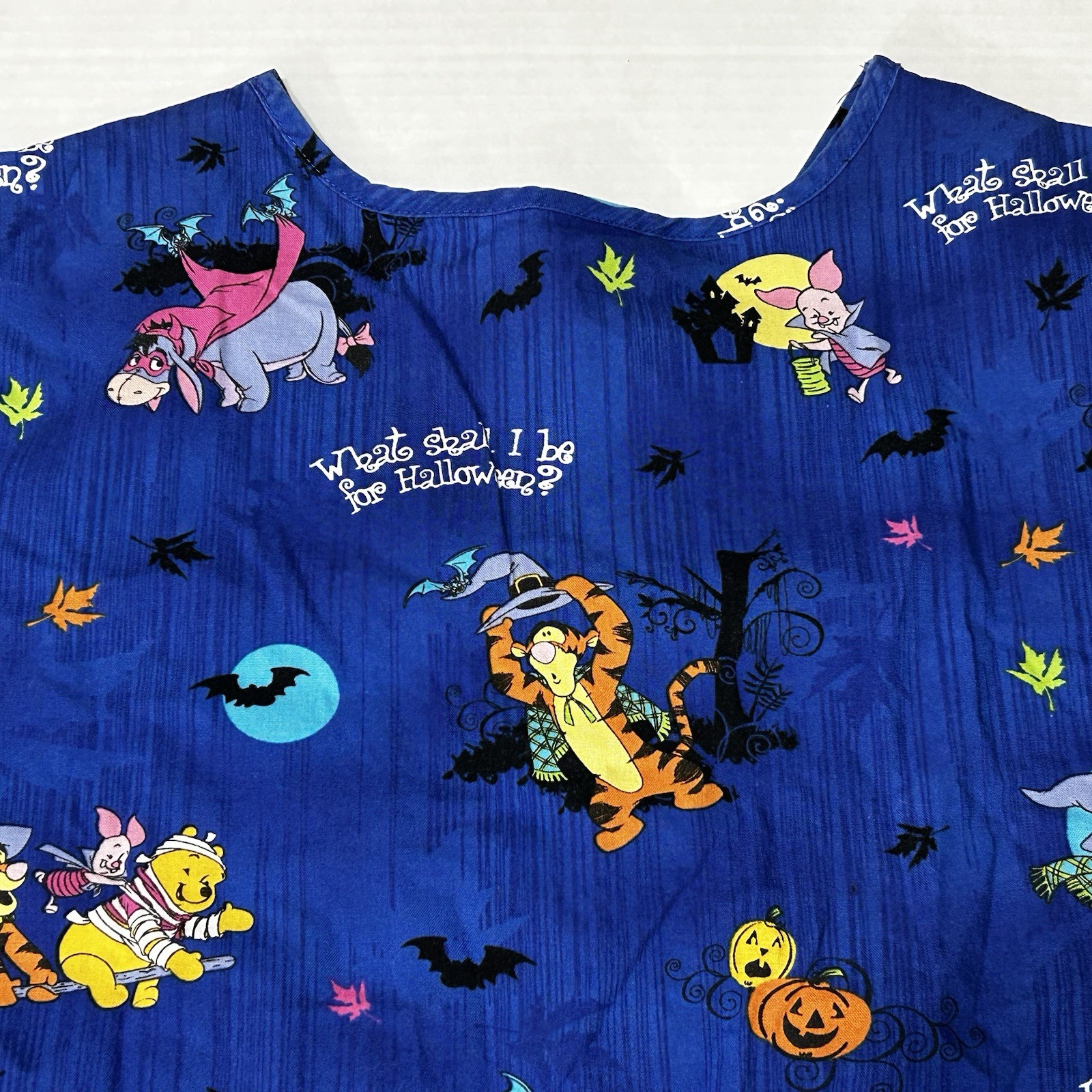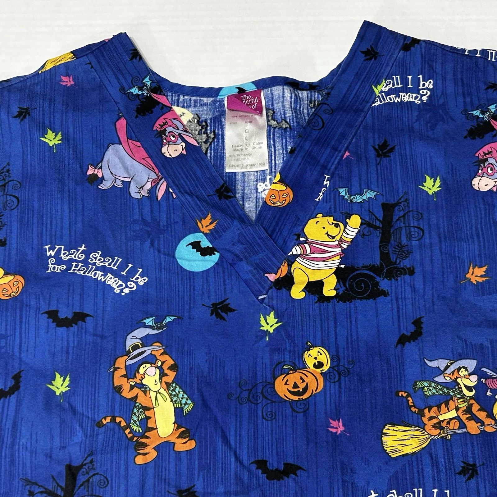 WINNIE THE POOH Womens Scrub Top Large Blue Halloween Eeyore Piglit Tigger Nurse