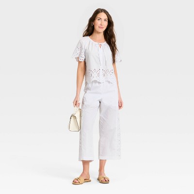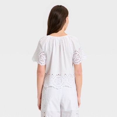 Women's Short Sleeve V-Neck Button-Front Eyelet Blouse - A New Day