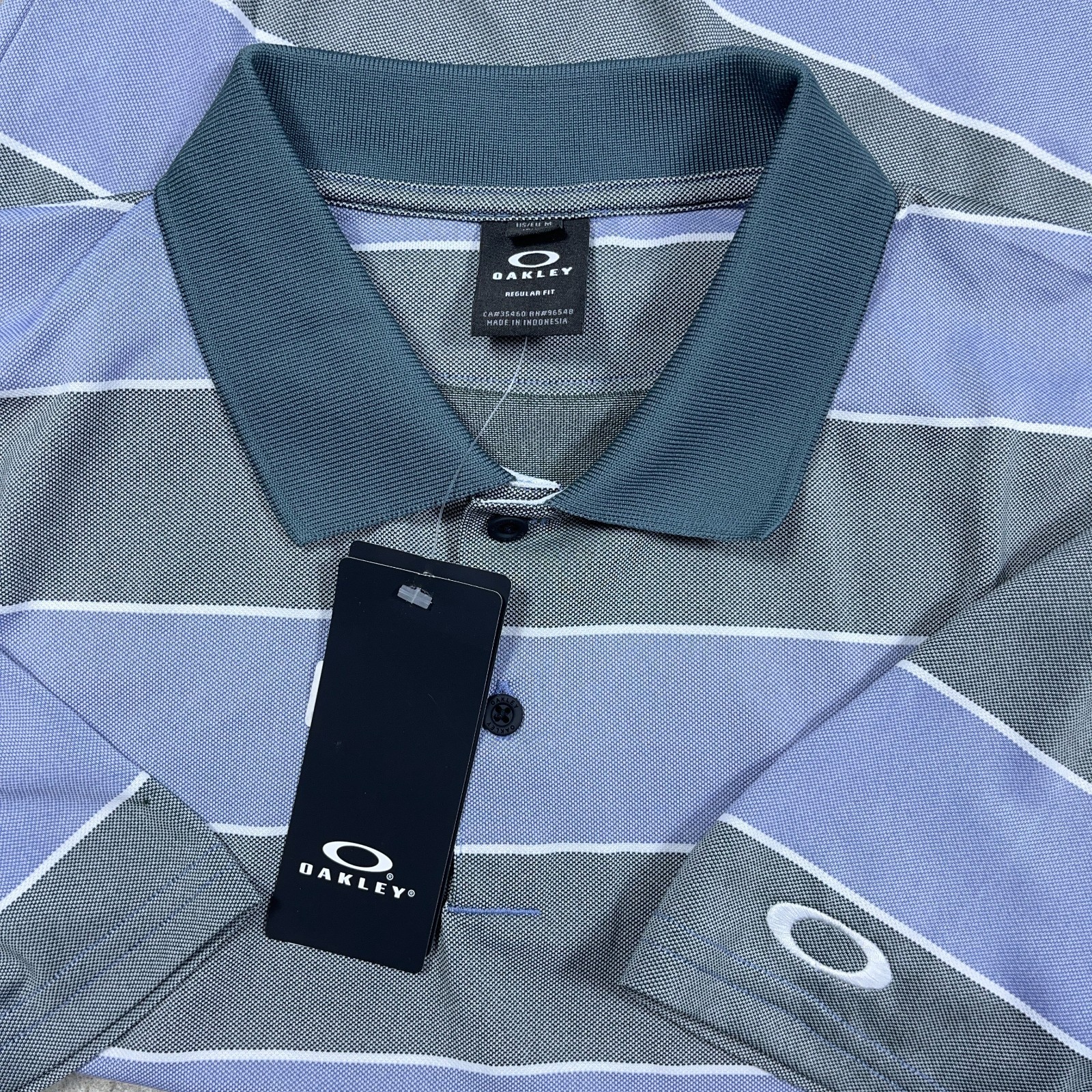 Oakley Polo Shirt Men Medium Blue Gray Striped Performance Wicking Golf NWT