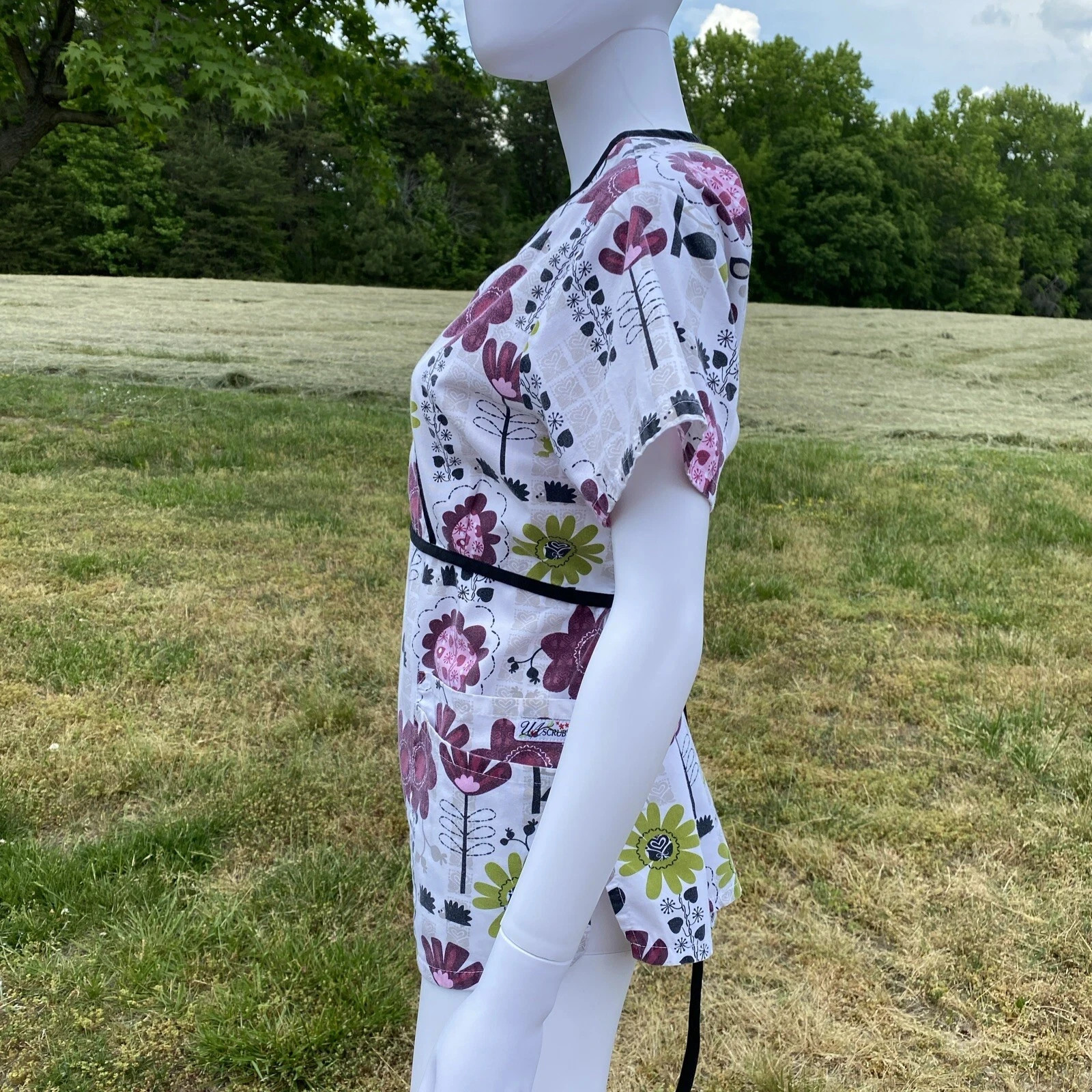 как выглядит UA Scrubs Floral Print Wrap Style Scrub Top White Burgundy Green Medium фото