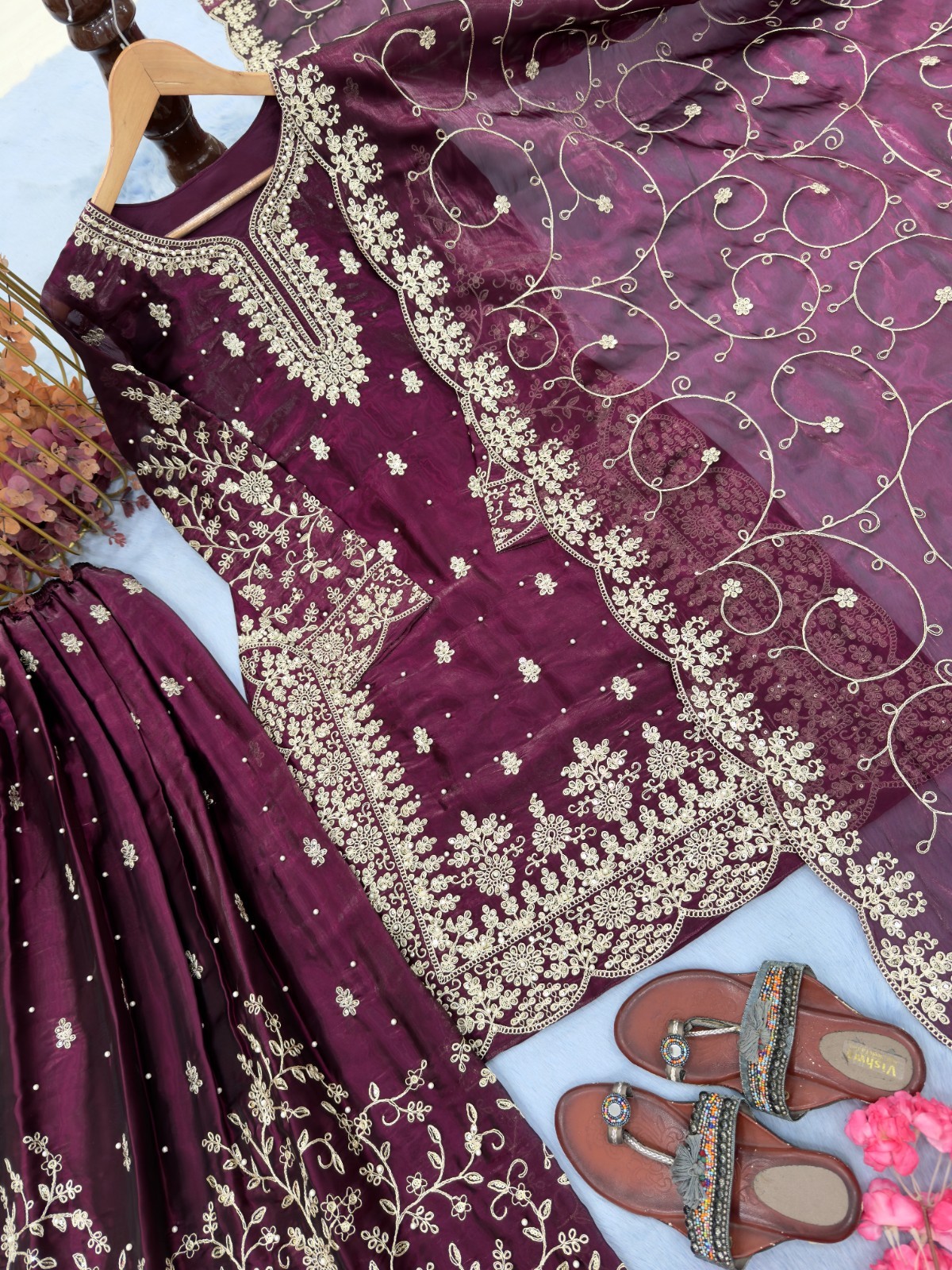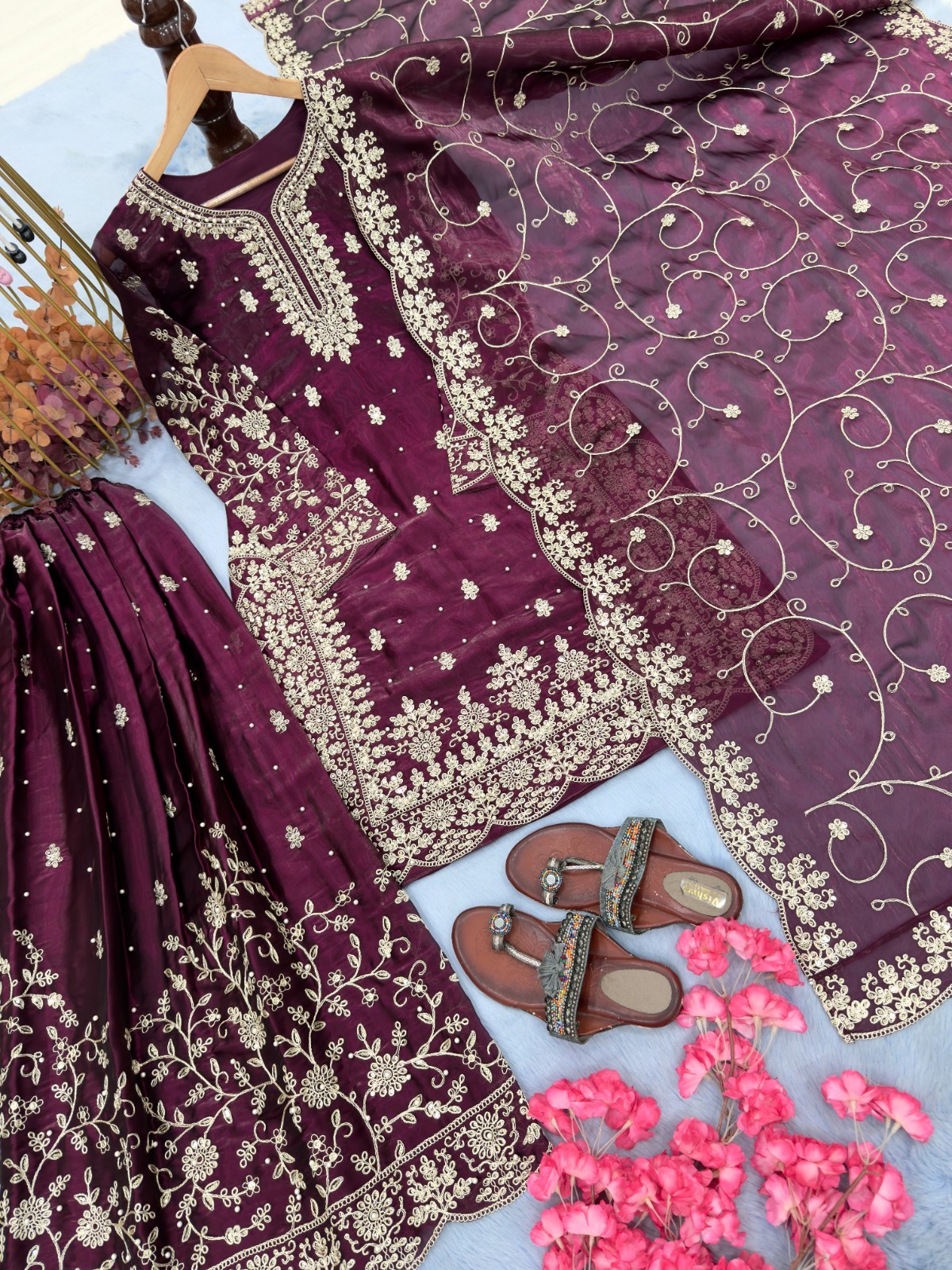 Plazzo Fabric: Pur Gmy Silk With Heavy Embroidery 3 mm Sequence & Coding Dori Wo