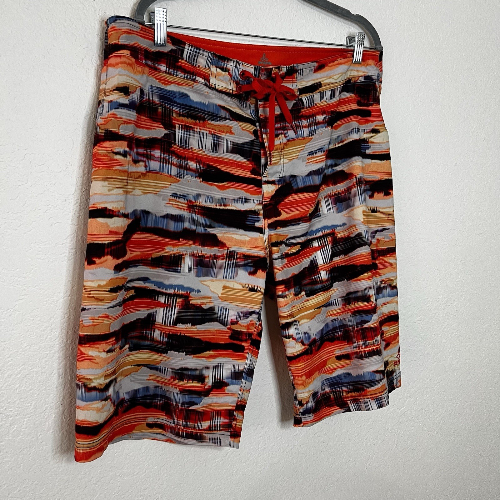 PrAna UPF 50 Orange Burnout Plaid Laced Unlined Board Swim Shorts Men s Size 36