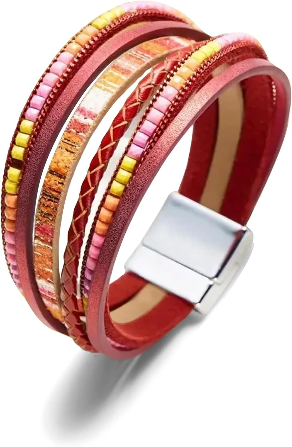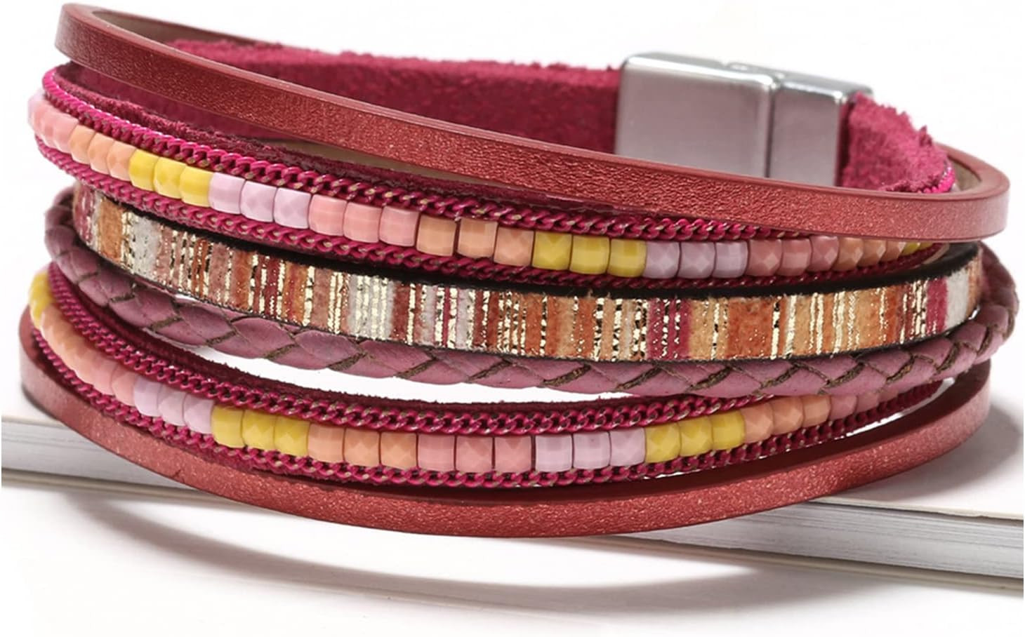 Leather Wrap Bracelets Boho Cuff Bangle Bracelets for Women Rhinestone Bead Brac