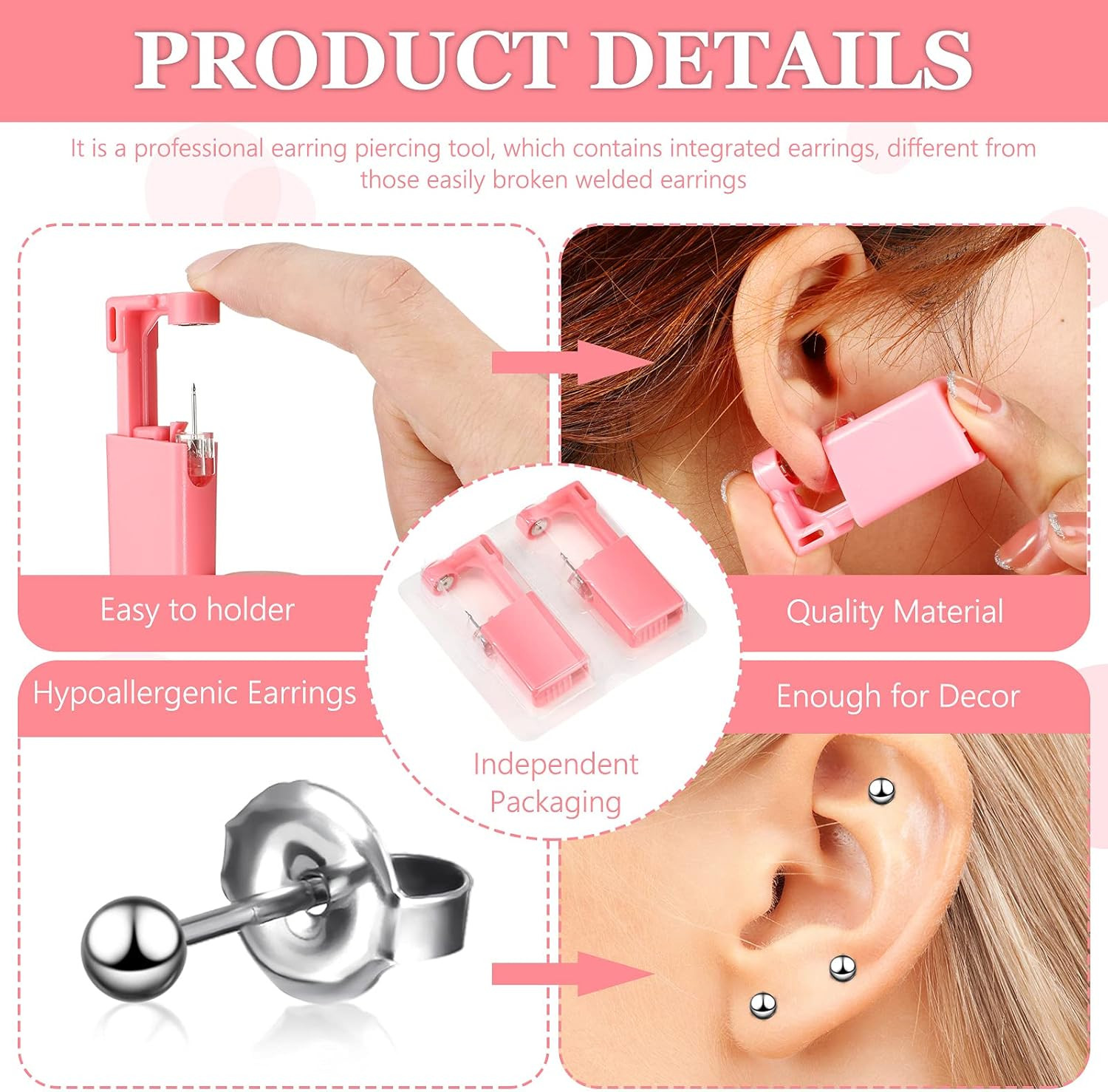 6Pc Ear Piercing Gun Kit Disposable Self Piercer Stud Earrings Set Pink