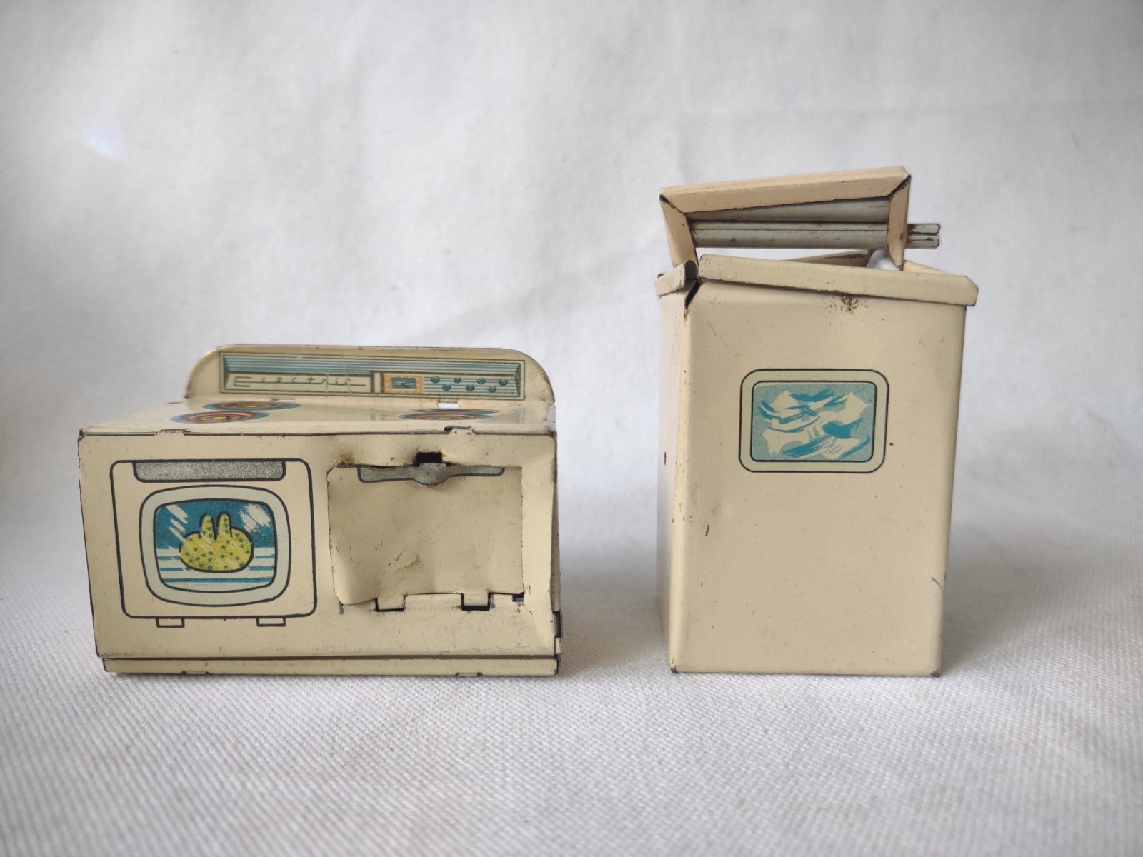 • Vtg Linemar Toy Litho Tin Dollhouse Kitchen Sink Stove Refrigerator Washer Japan