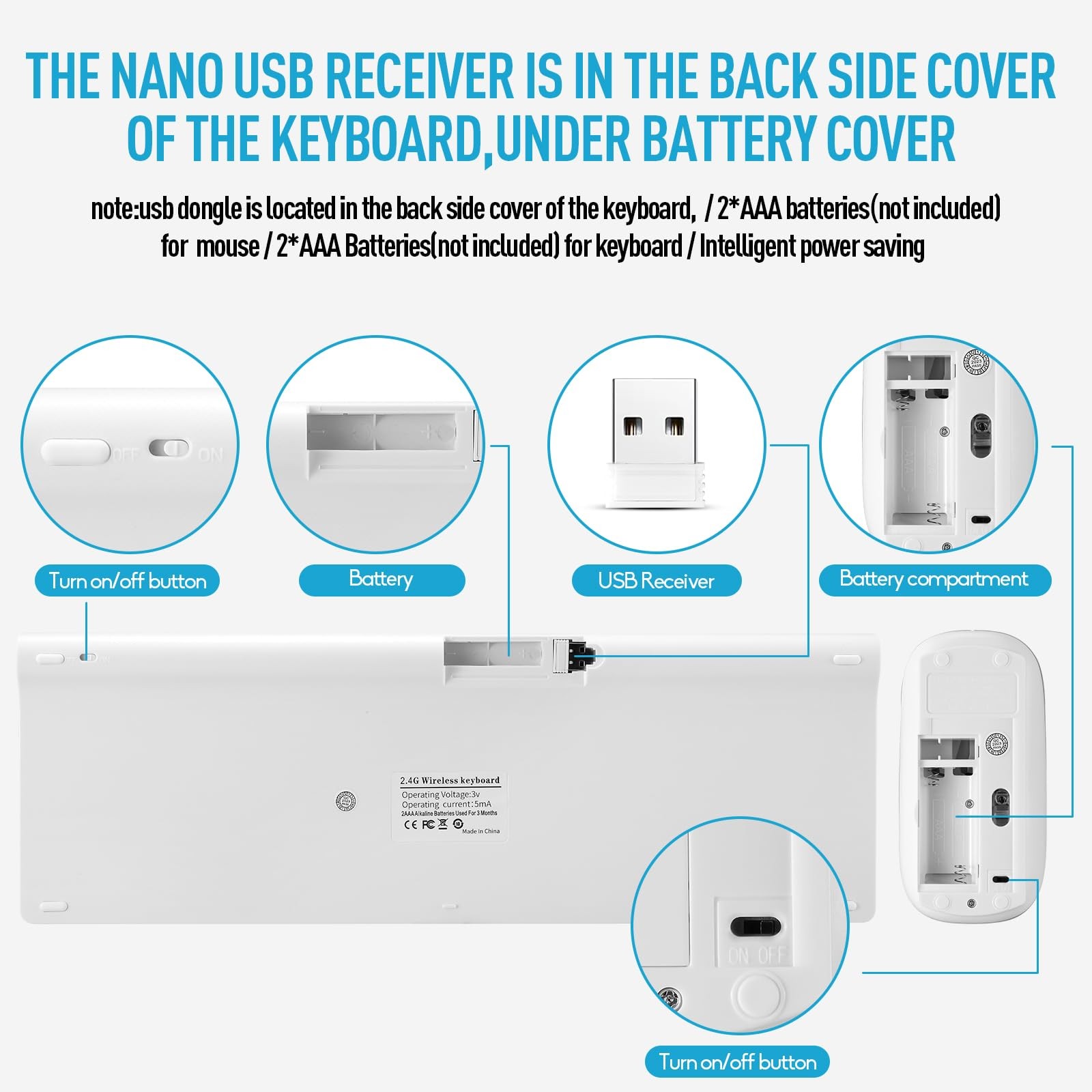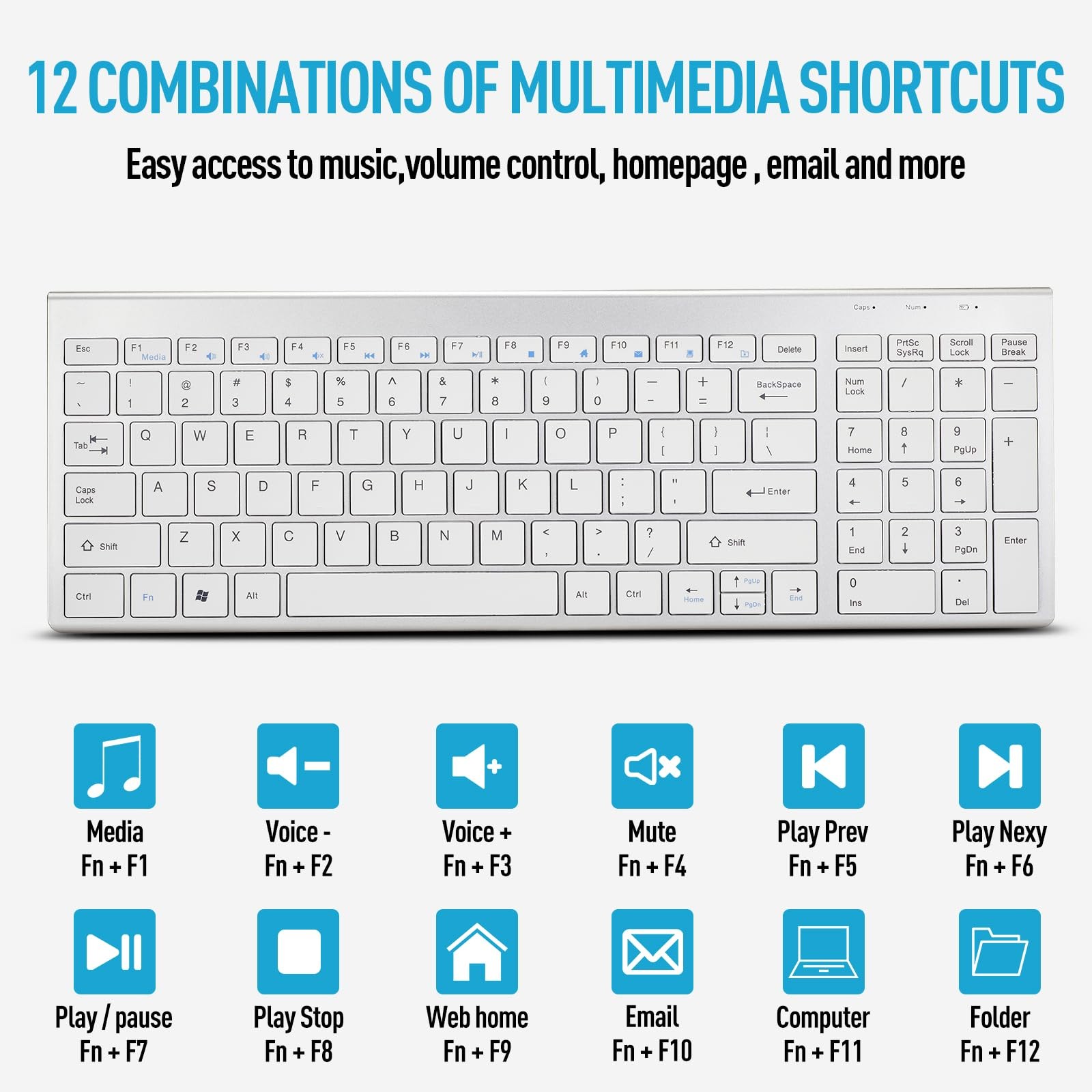 Silver White Wireless Keyboard Mouse Combo Compact Quiet 2.4G Ultra Thin PC