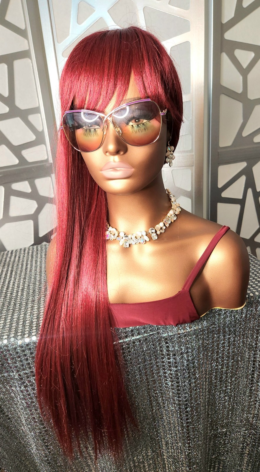 как выглядит Red Wig with Bangs Straight Wig Long Red Wig Burgundy Red Wigs Glueless Heatsafe фото