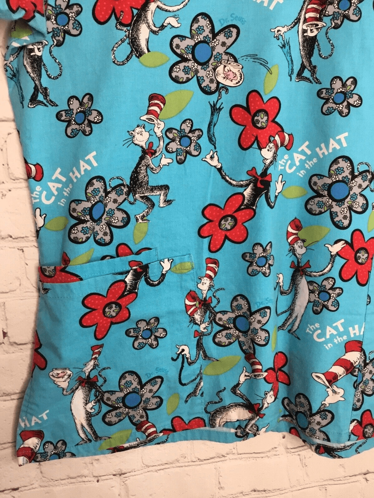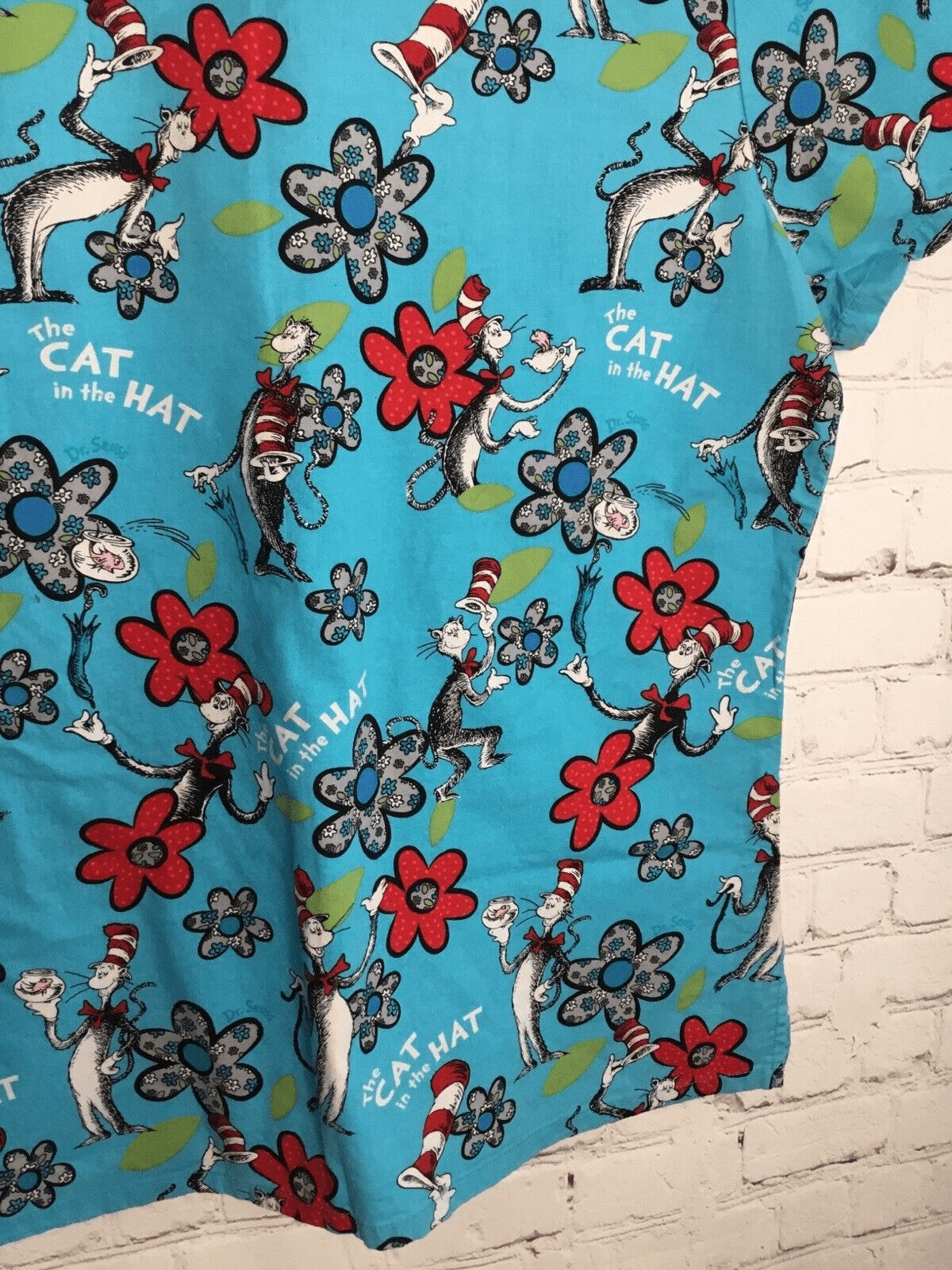 Cherokee Dr Seuss CAT IN THE HAT Women SCRUB TOP Sz M 100 Cotton Blue