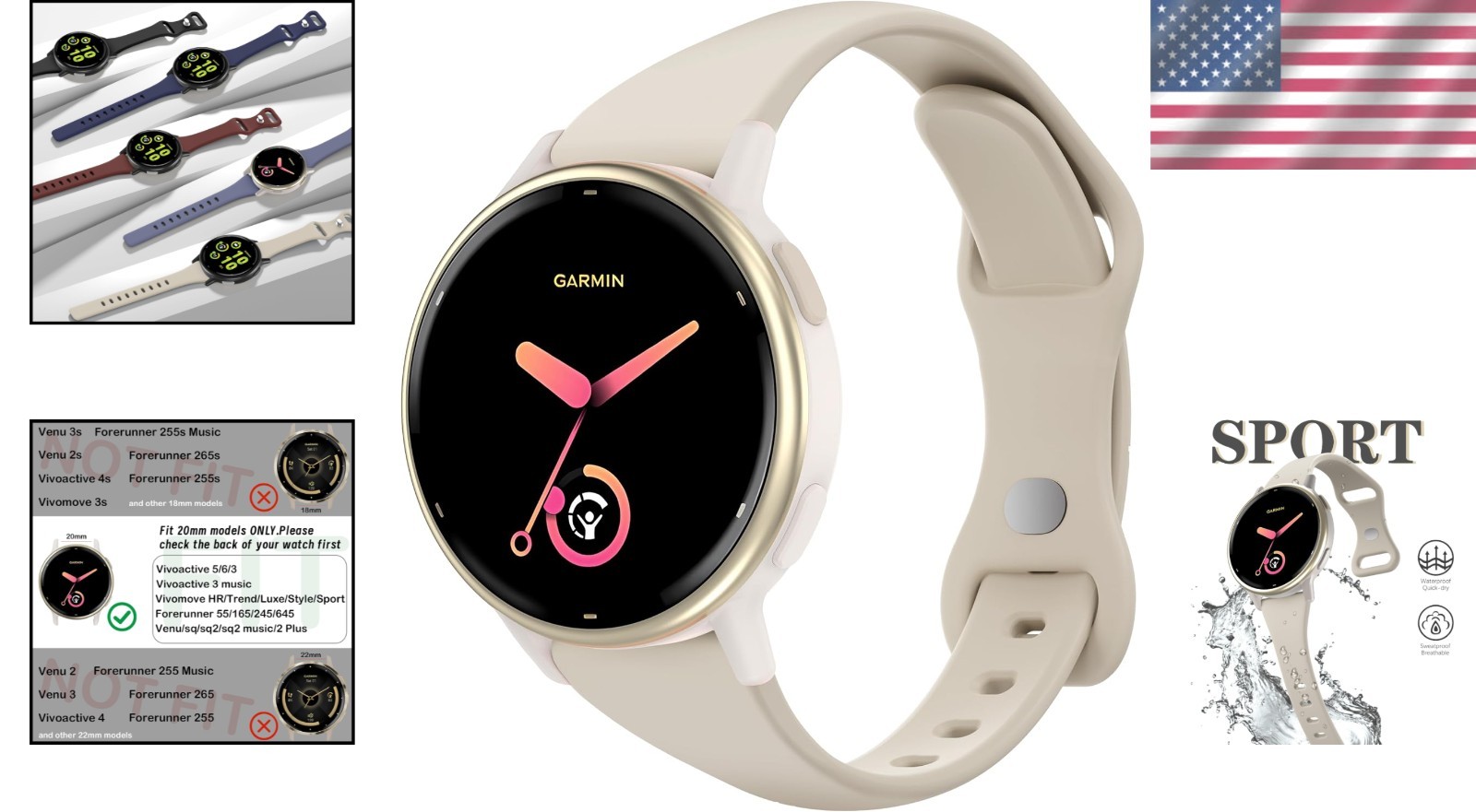 Waterproof 20mm Silicone Watch Band Compatible with Garmin Venu SQ2