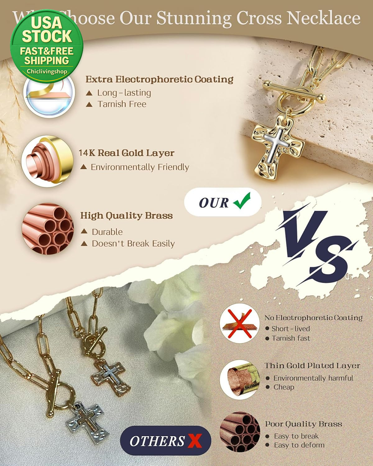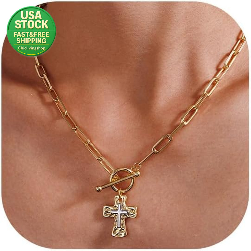 Chunky Cross Necklace for Women 14K Gold Plated Paperclip Chain Religious