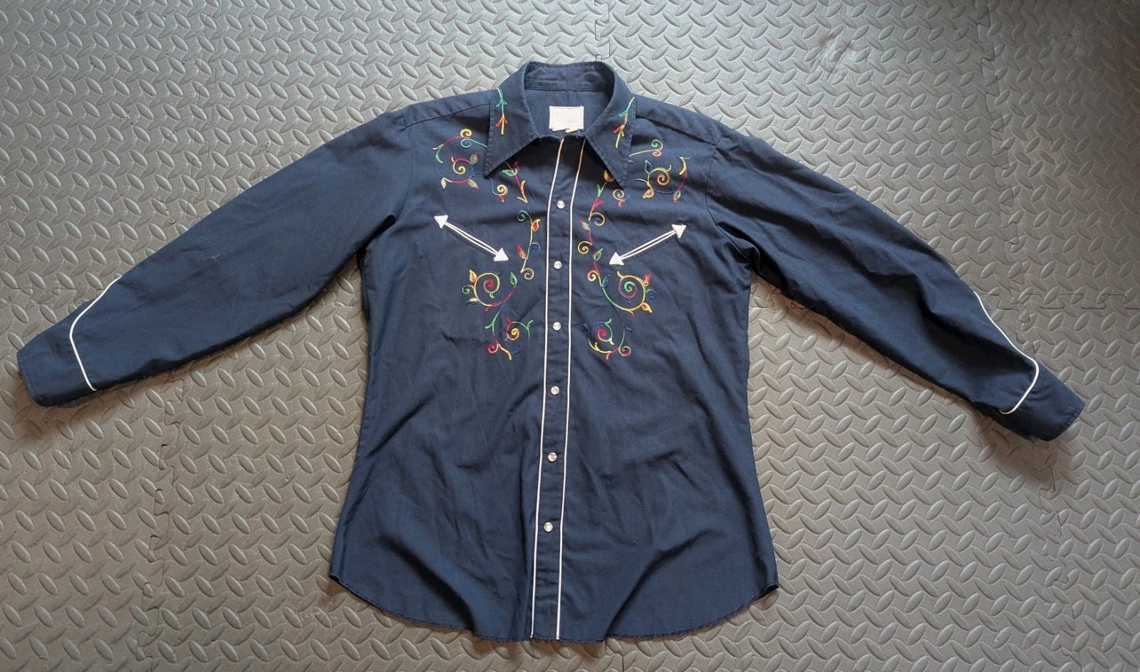 Vintage 1960s H Bar C CA Embroidered Pearl Snap Blue Western Cowboy Shirt M/L