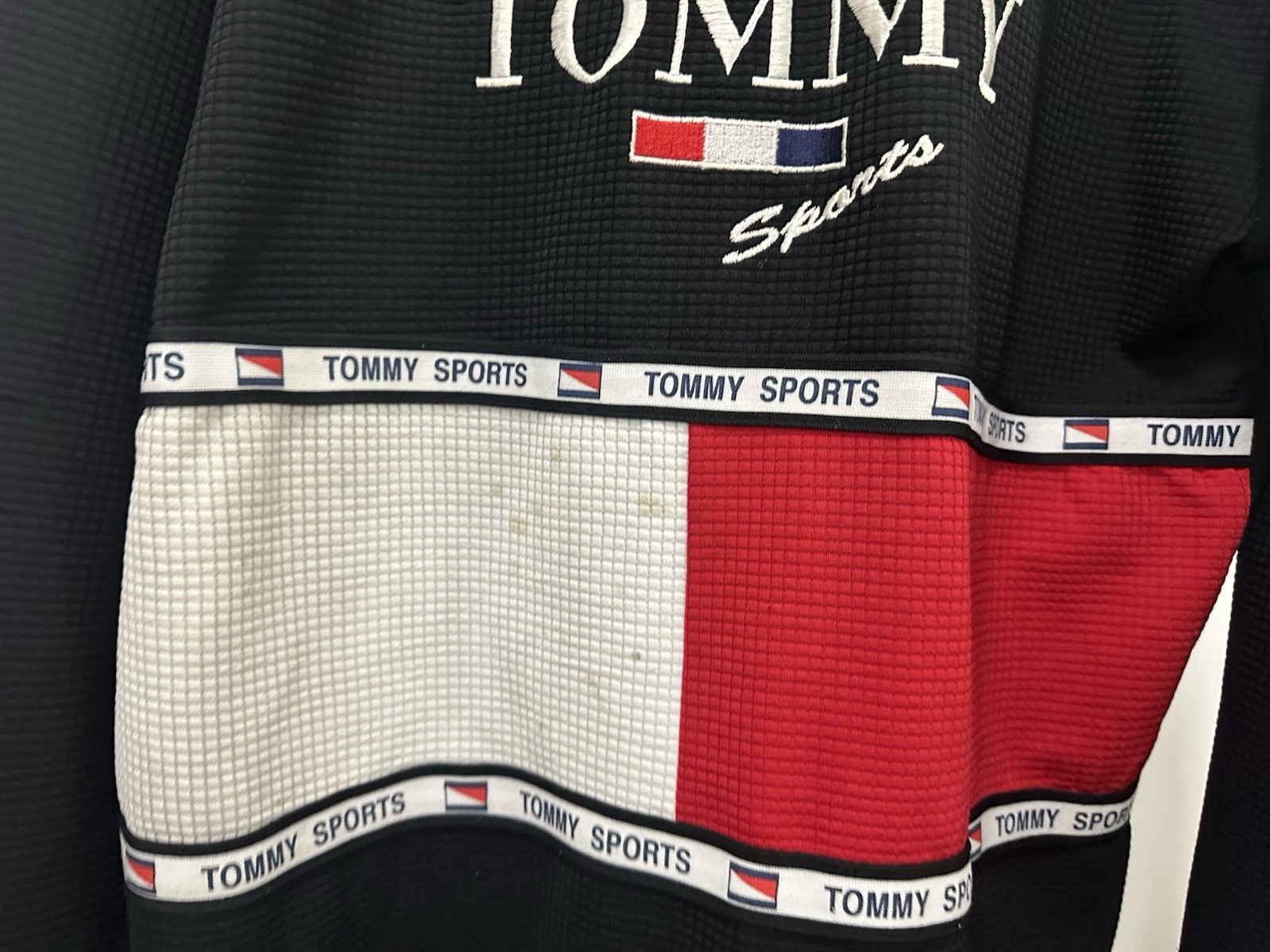 как выглядит VTG 90s Tommy Sports BL Big Flag Spellout Zip Polo Jersey Shirt XL фото