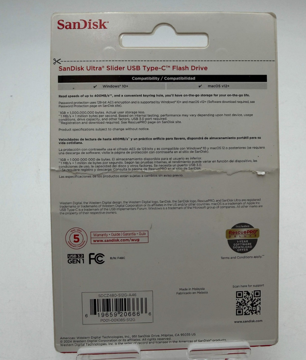 SANDISK- 512GB Ultra Slider USB Type-C Flash Drive - Black NEW